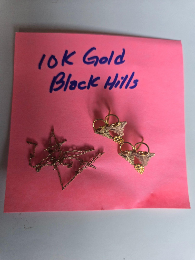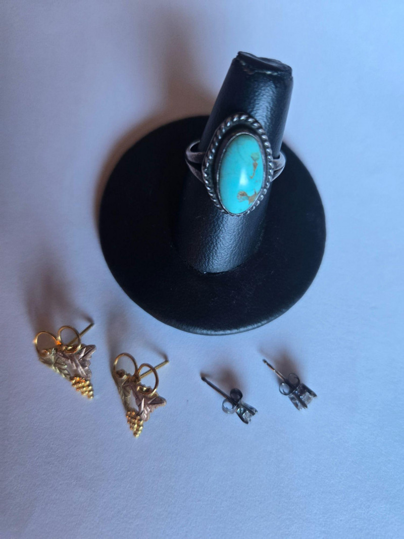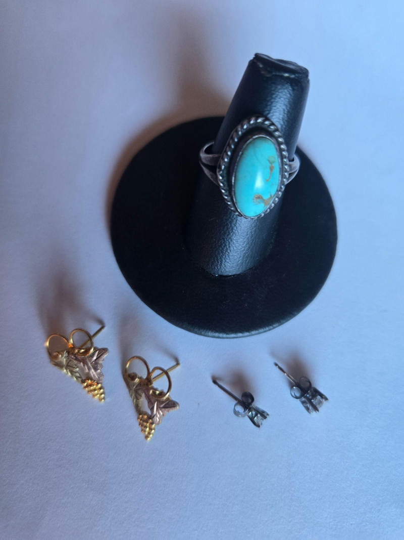 Turquoise‑style stone with metal backing behind the stone for stability and shine. 10k Gold Black Hills Pieces