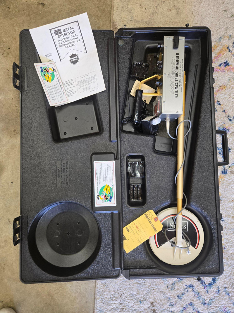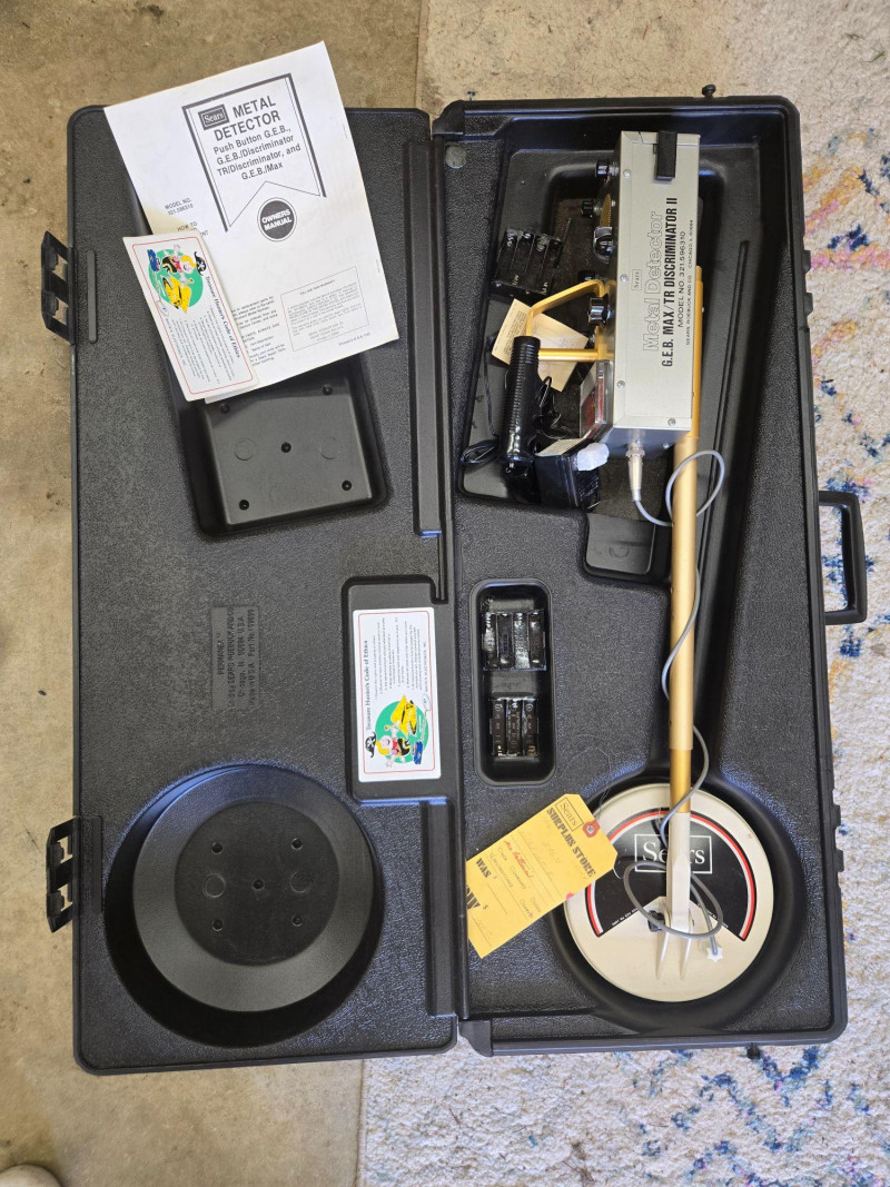 A well‑preserved vintage Sears G.E.B. MAX II Discriminator II metal detector, complete in its original hard carrying case with manuals and accessories. A great find for collectors of retro electronics, hobbyists, or anyone who appreciates classic treasure‑hunting gear. Sears G.E.B. MAX II Discriminator II Metal Detector