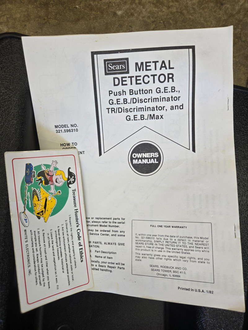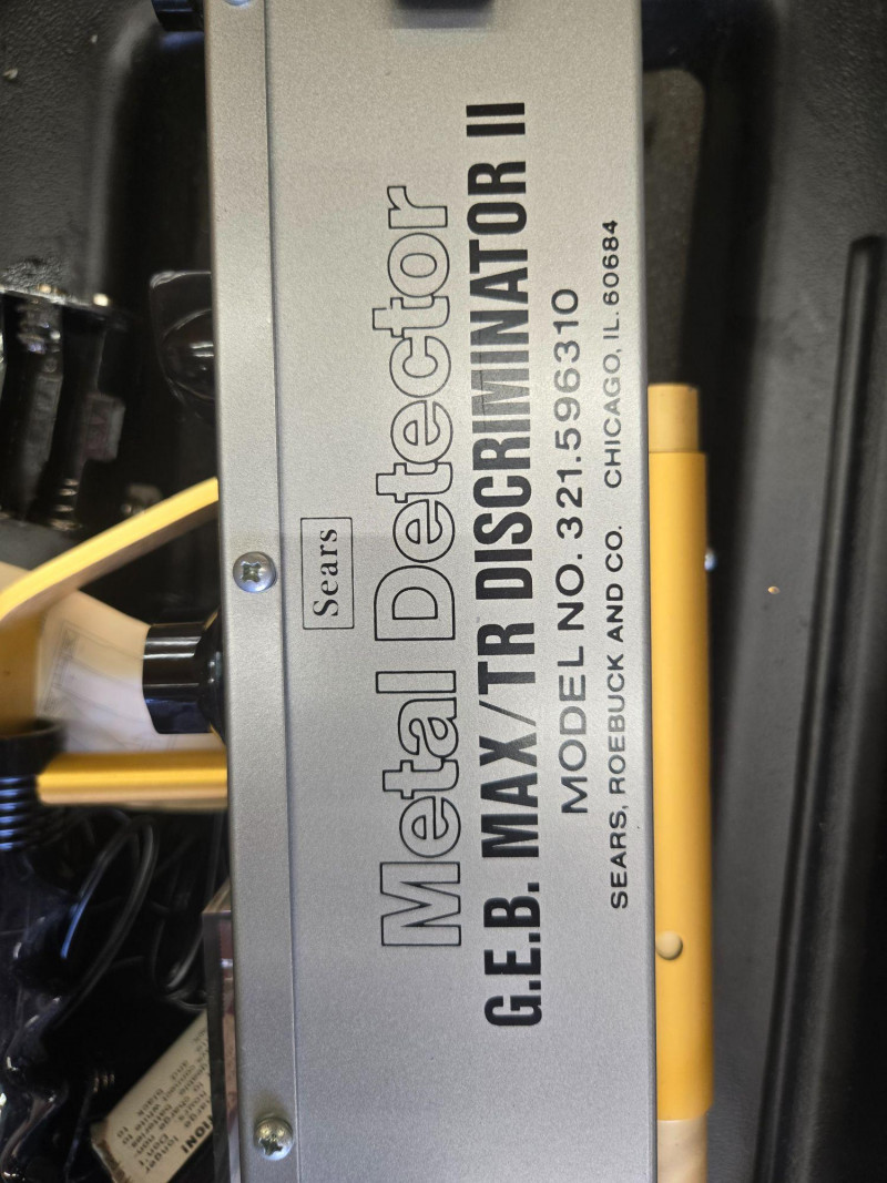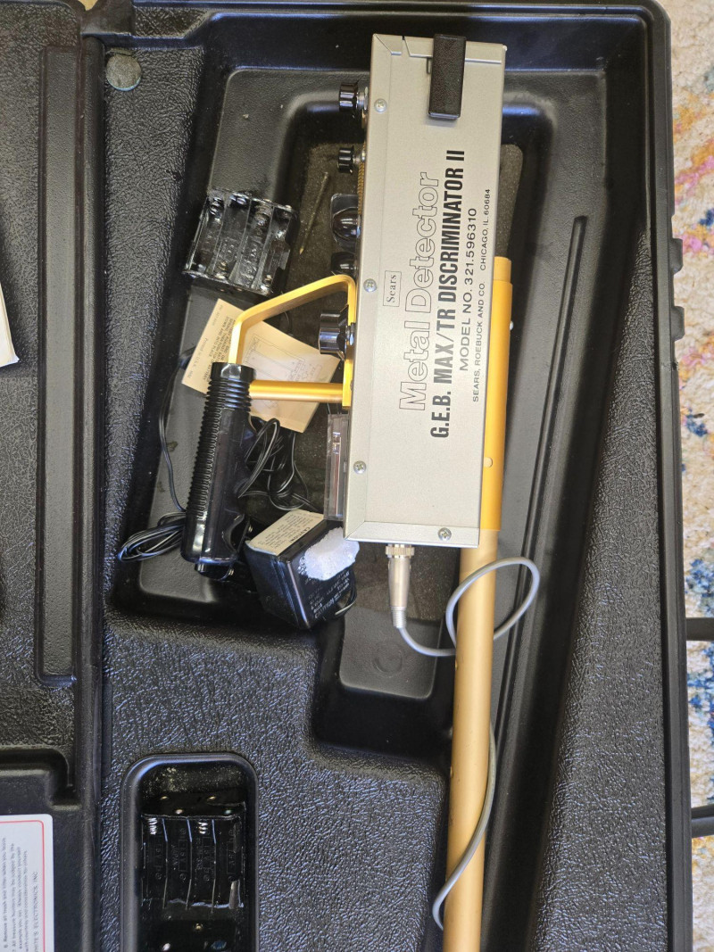 Coiled cables, flashlight, battery compartments, and assorted small components Appears complete with typical age‑related wear to case and components. Electronics untested. Sold AS IS, WHERE IS.Sears G.E.B. MAX II Metal Detector (with Case & Accessories)