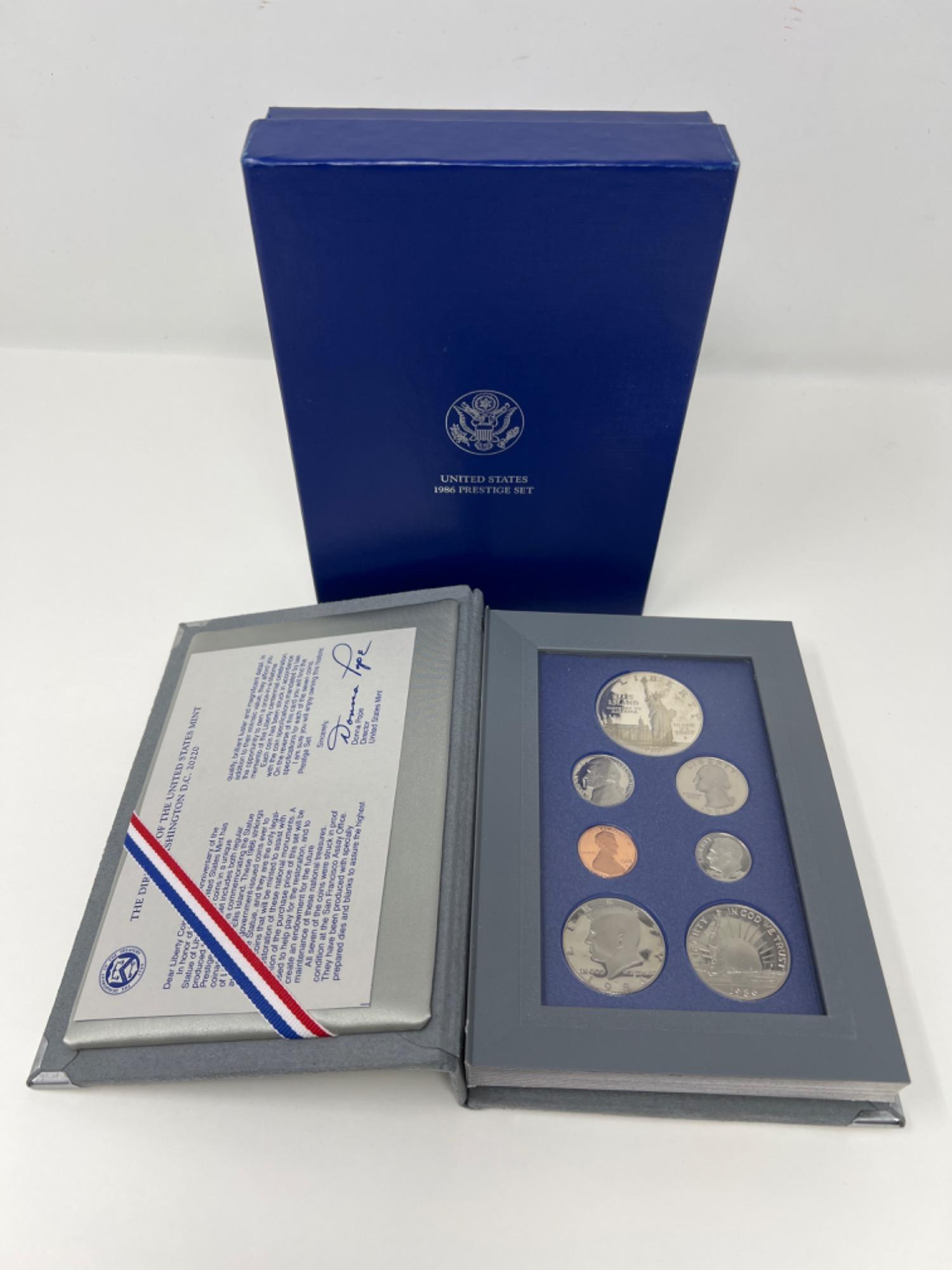 United States 1986 Prestige Coin Set includes: Liberty $1 coin; Kennedy Half Dollar; Liberty Half Dollar; Quarter, Nickel, Dime and Penny. Also includes original certificate and collector portfolio and box.
