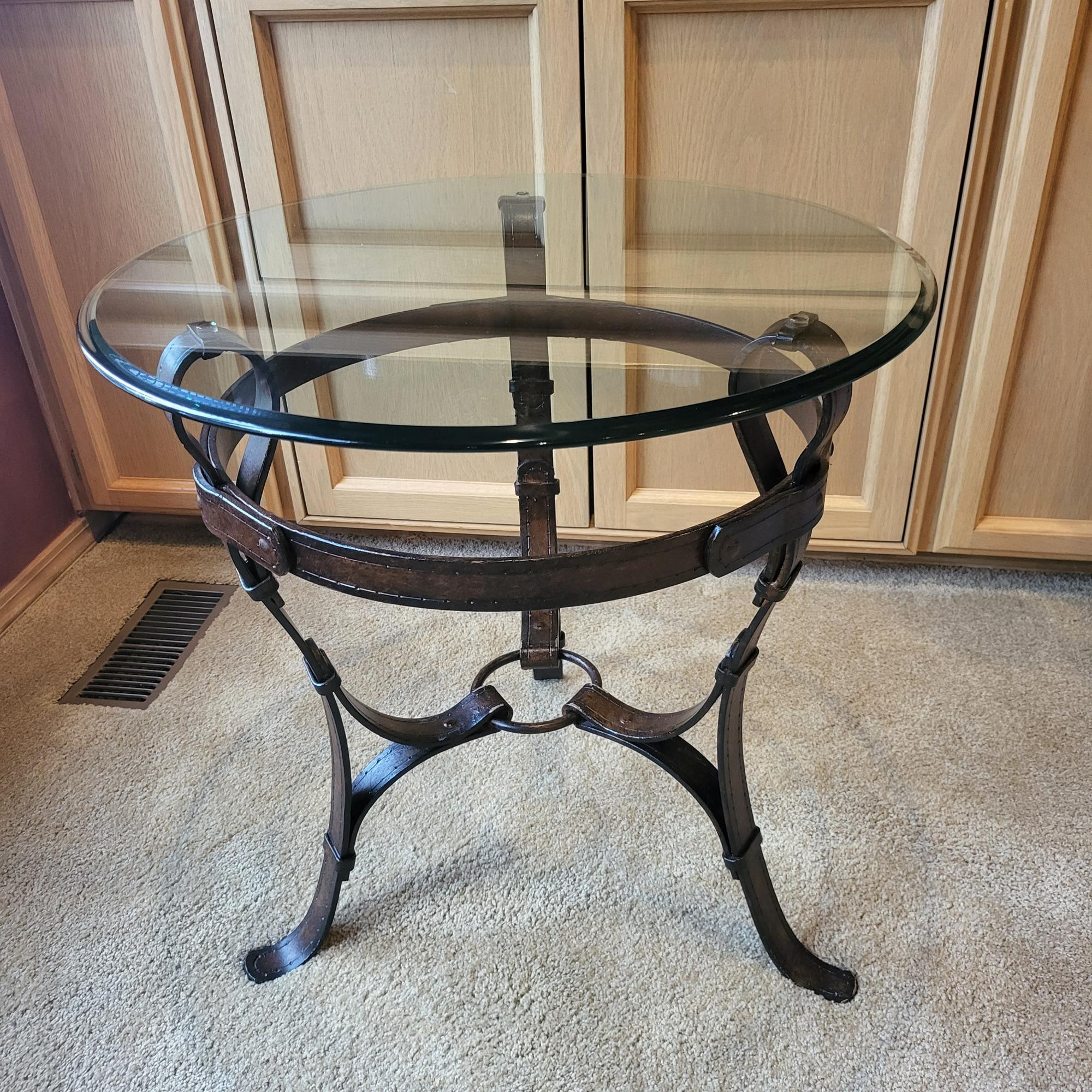 Vintage (mid century) western equestrian round glass top side table with iron leg supports. Iron is fashioned with a leather faux appearance to reflect straps or saddle. Glass top is removable. In excellent vintage condition. 23.75" round x 24" tall. Value: $895 - $1,000 See lots 13 and 14 for matching coffee/cocktail table and couch side table. Bidding on this lot is an agreement that: (1.) You