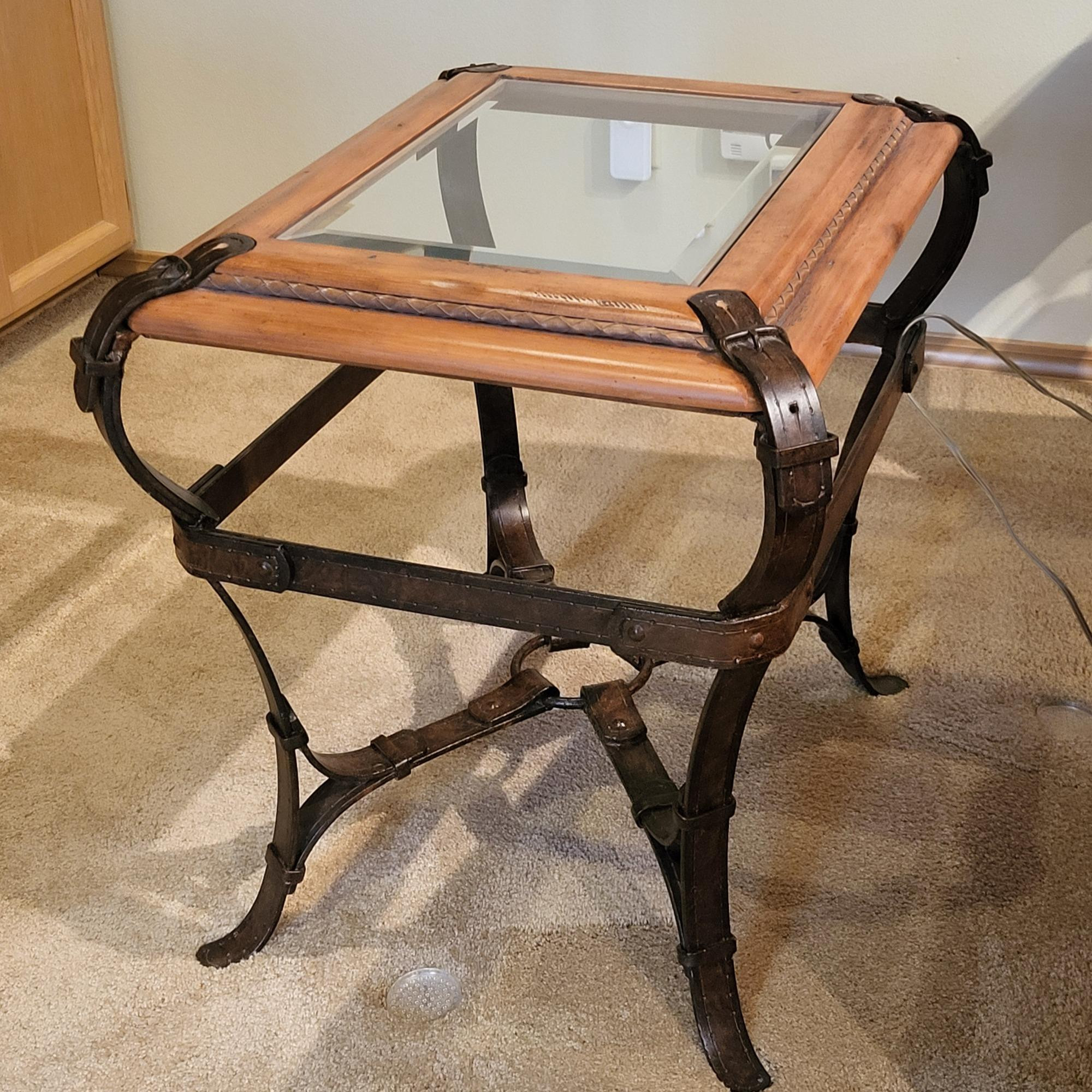 Side table is a vintage Adnet Hermes wood/iron/glass side table that is in the same style as the coffee table in Lot 13. Glass is beveled. Leg supports have a faux leather look (made of iron) and assimilate straps/belt and buckles. Mid-century modern. Dimensions: 27" long x 21" wide x 22.5" height. Bidding on this lot is an agreement that: (1.) You