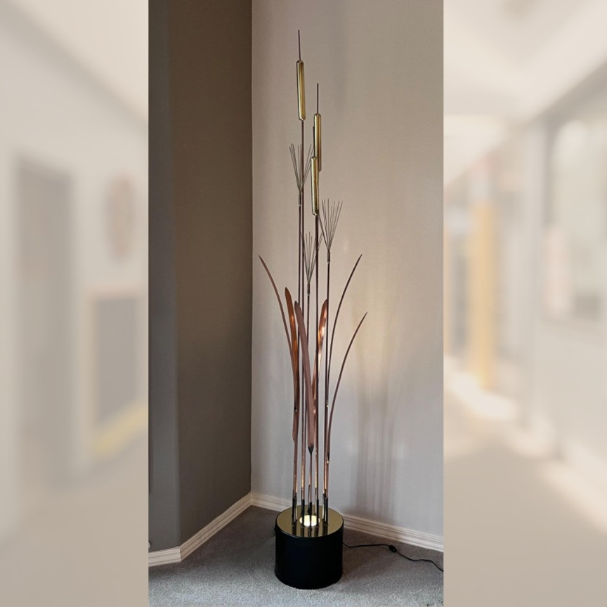 An extra tall Curtis Jere 1977 cattail sculpture with light in the base. It is over 6 feet tall. The cattail metal sculpture is in outstanding condition. The sculpture features copper leaves and brass cattails with brass reed like rods. 79" tall x 10.25" diameter base.