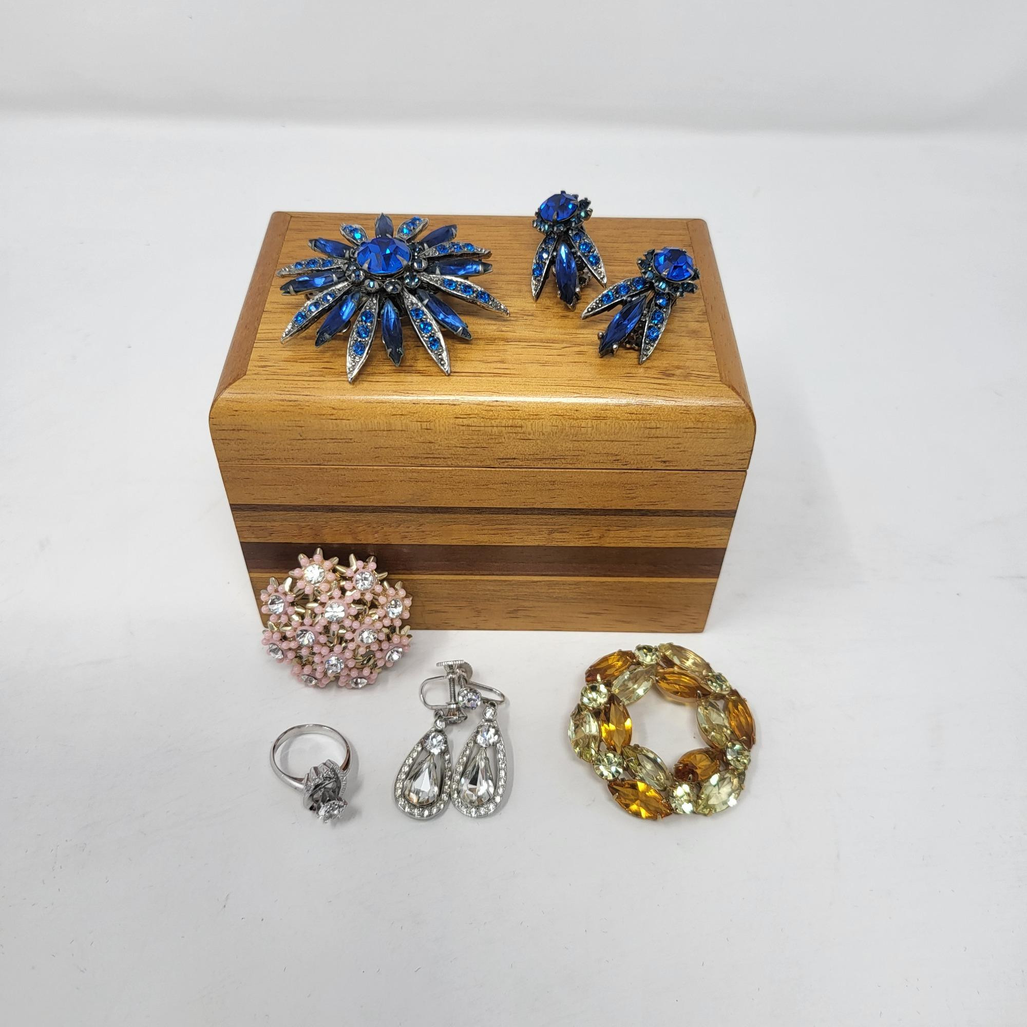 Blue hues rhinestone starburst brooch 2.25" with matching clip earrings 1.75" Yellow/topaz rhinestone circle brooch 1.75" Pink lucite and clear rhinestone floral brooch 1.5". Sparkly clear tear drop shape dangle screw back earrings 1.75". White gold EP (plated) clear stone ring about size 4. 4.25" x 3" x 3" vintage walnut treasure box with artist initial carved on bottom.