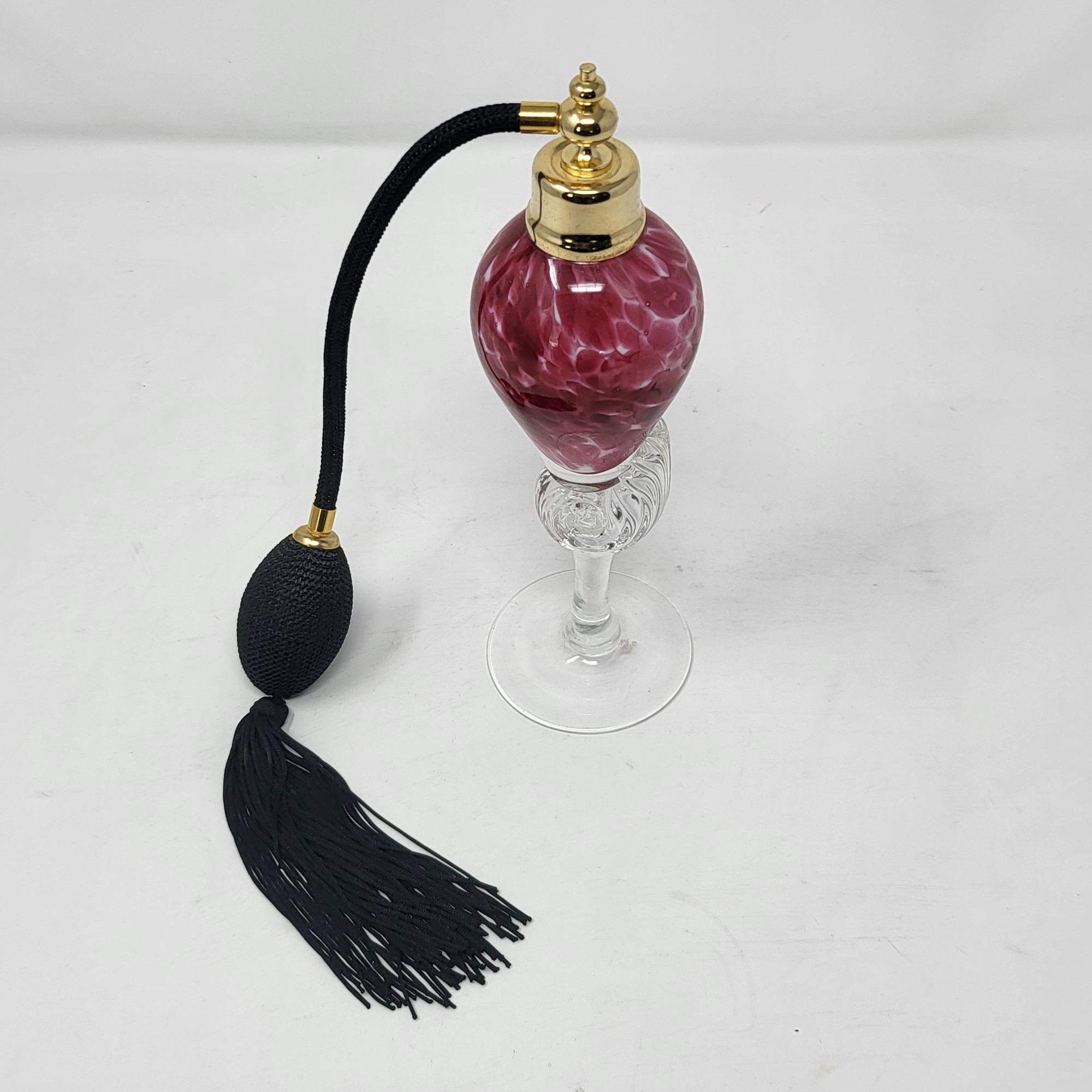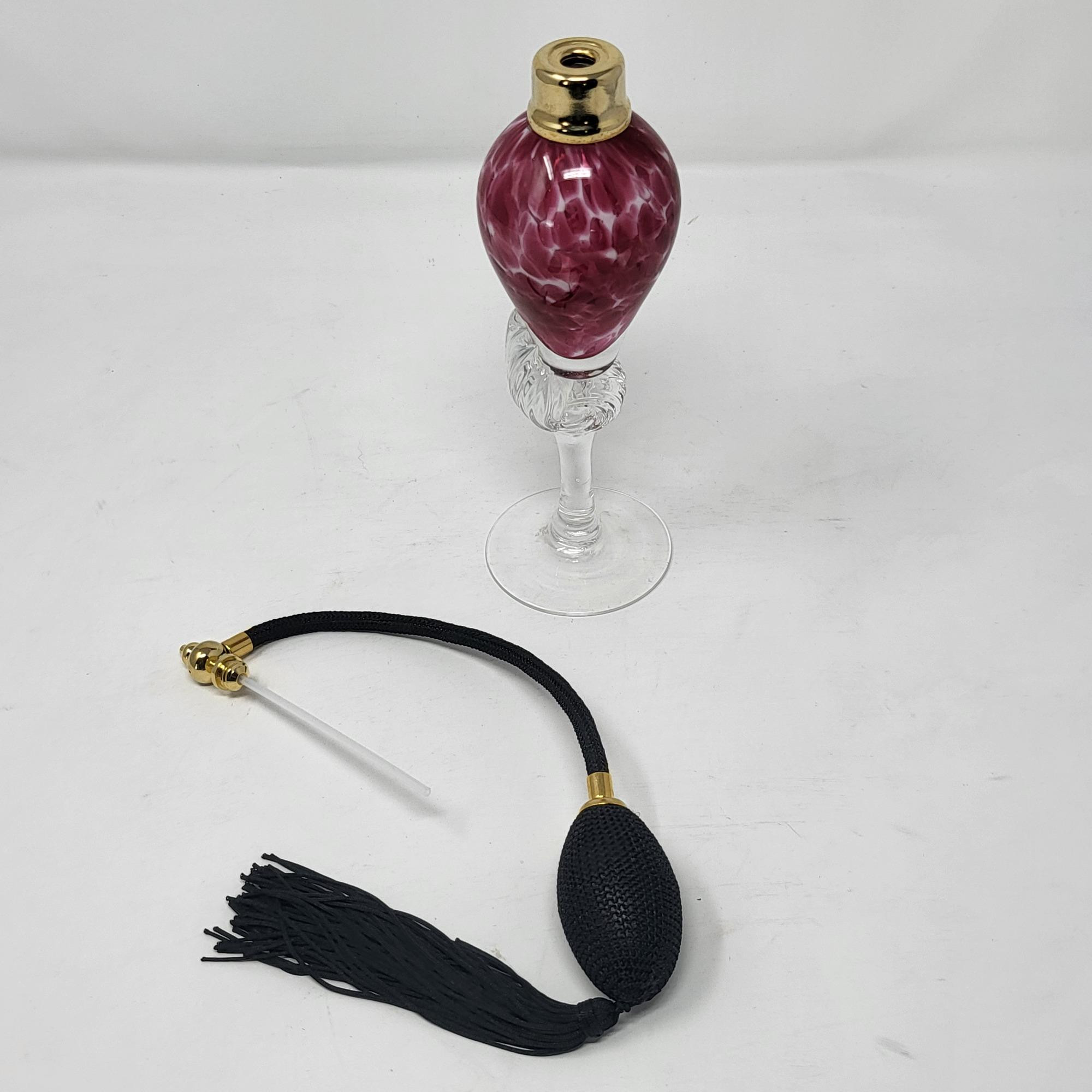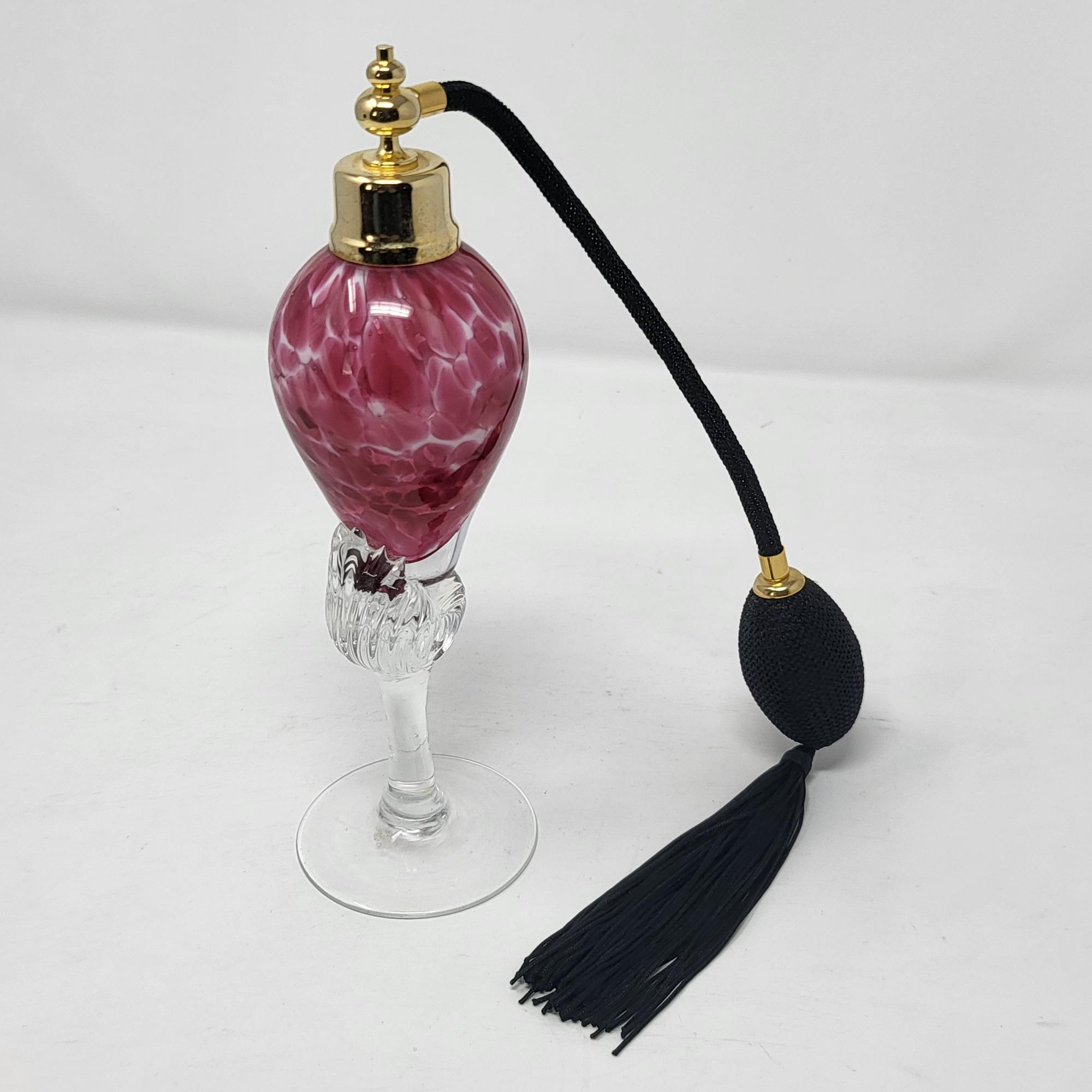 Excellent condition, spotted pink glass bottle and clear swirl glass stem, perfume bottle 8.25" T. Atomizer works perfect.