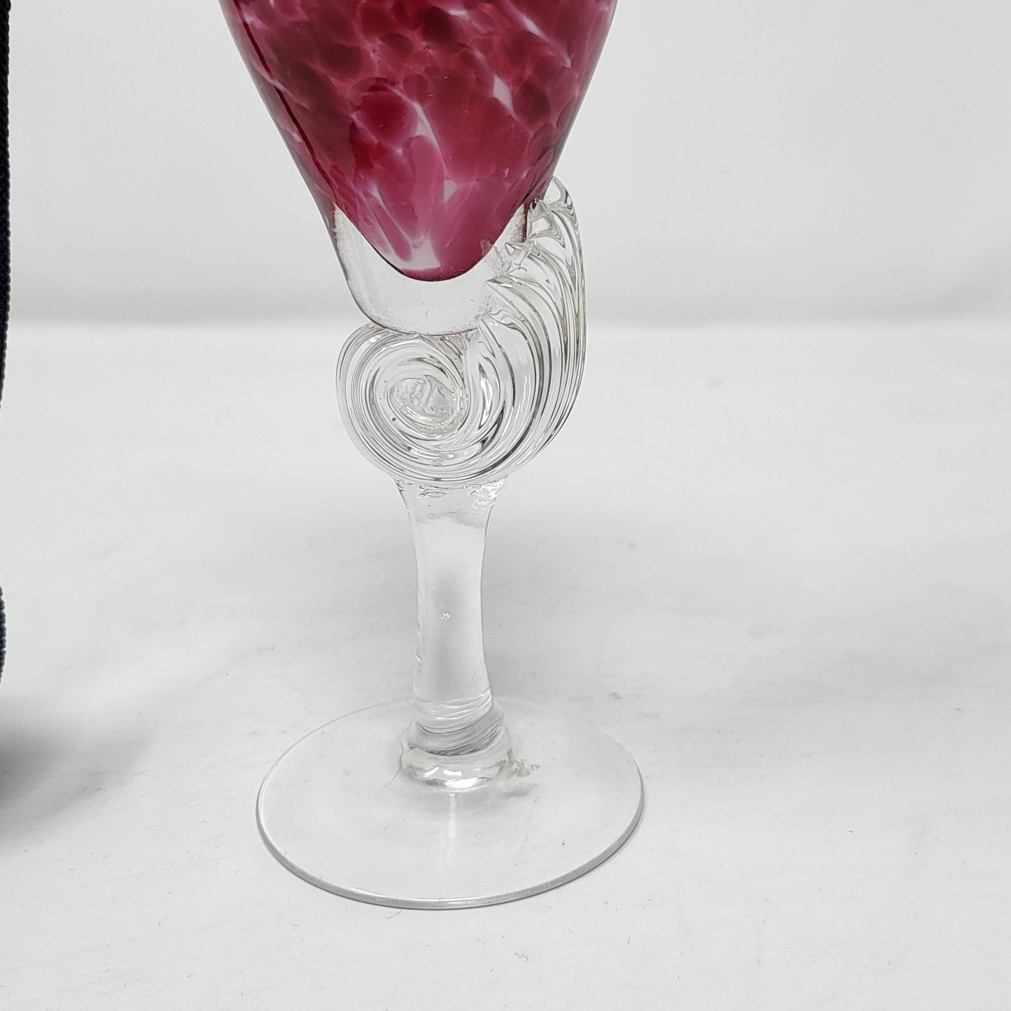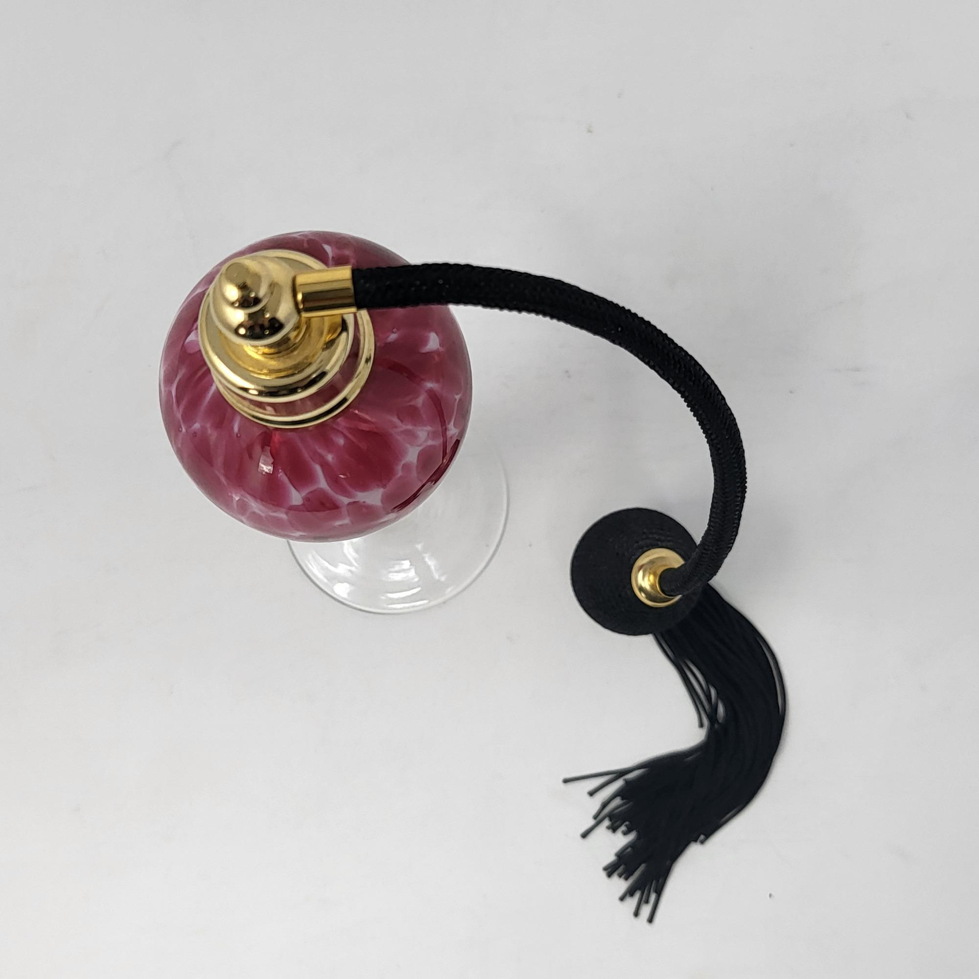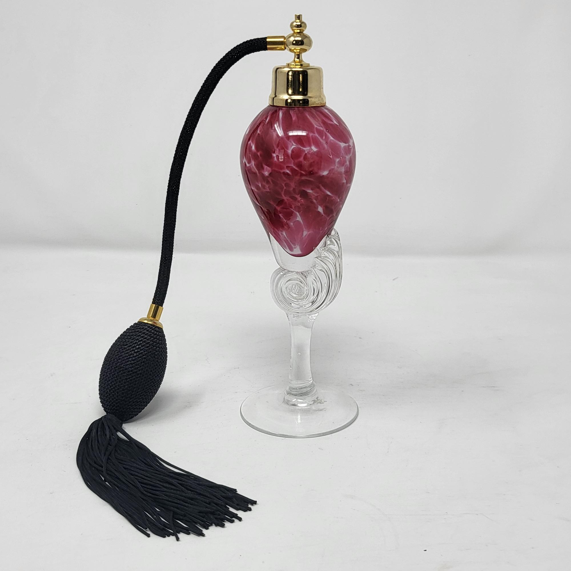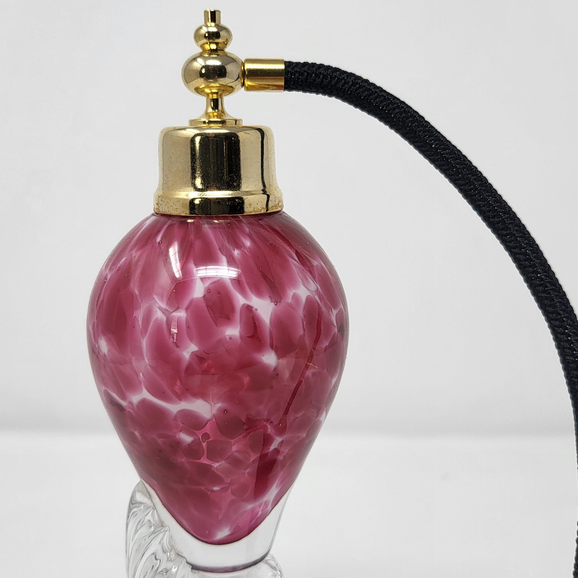Excellent condition, spotted pink glass bottle and clear swirl glass stem, perfume bottle 8.25" T. Atomizer works perfect.