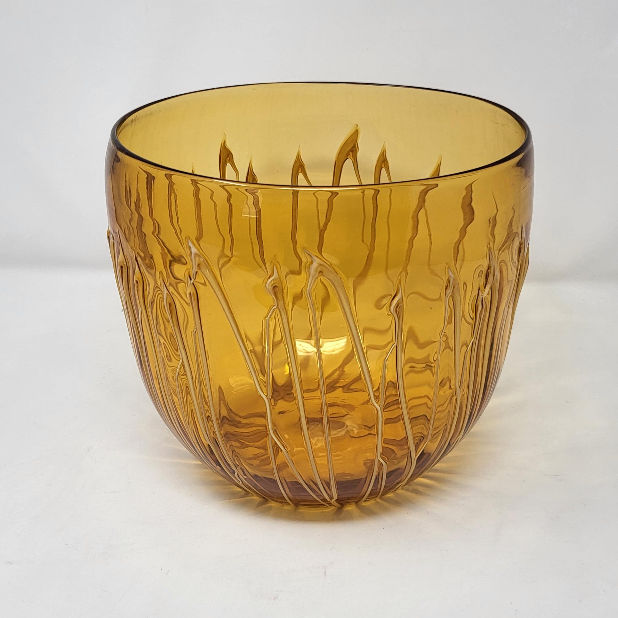 Unique raised and white stripe pattern all around. This gorgeous amber art glass bowl measures 7.5" T x 8" W. Much more impressive in person.