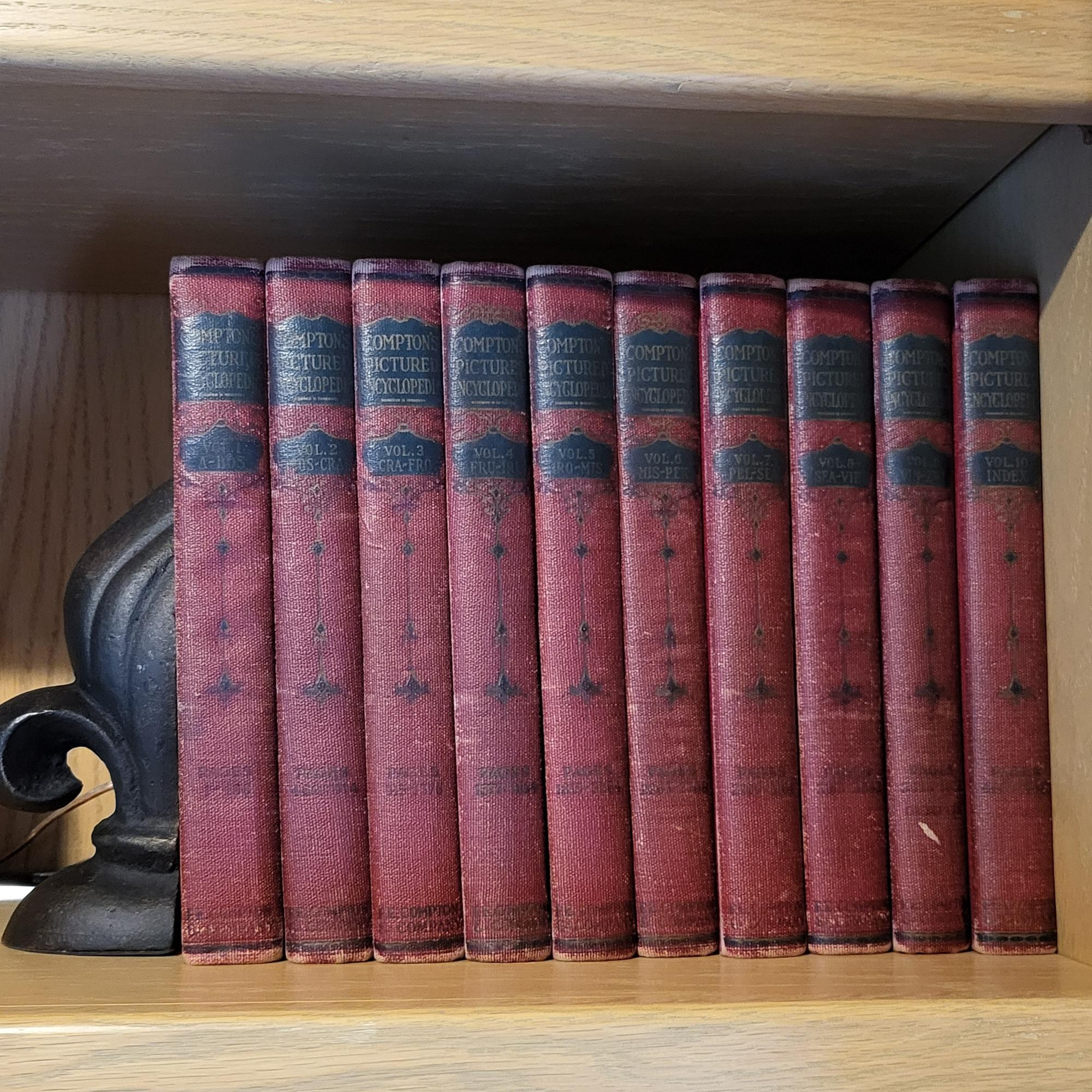 Hardback books. 1929 Comptons Pictured Encyclopedias, Volumns 1-10. Many beautiful pages of colored pictures. Spine, binding, covers, edges and pages are all in very good condition for being almost 100 years old. Name of former owner is written on top right page inside cover.