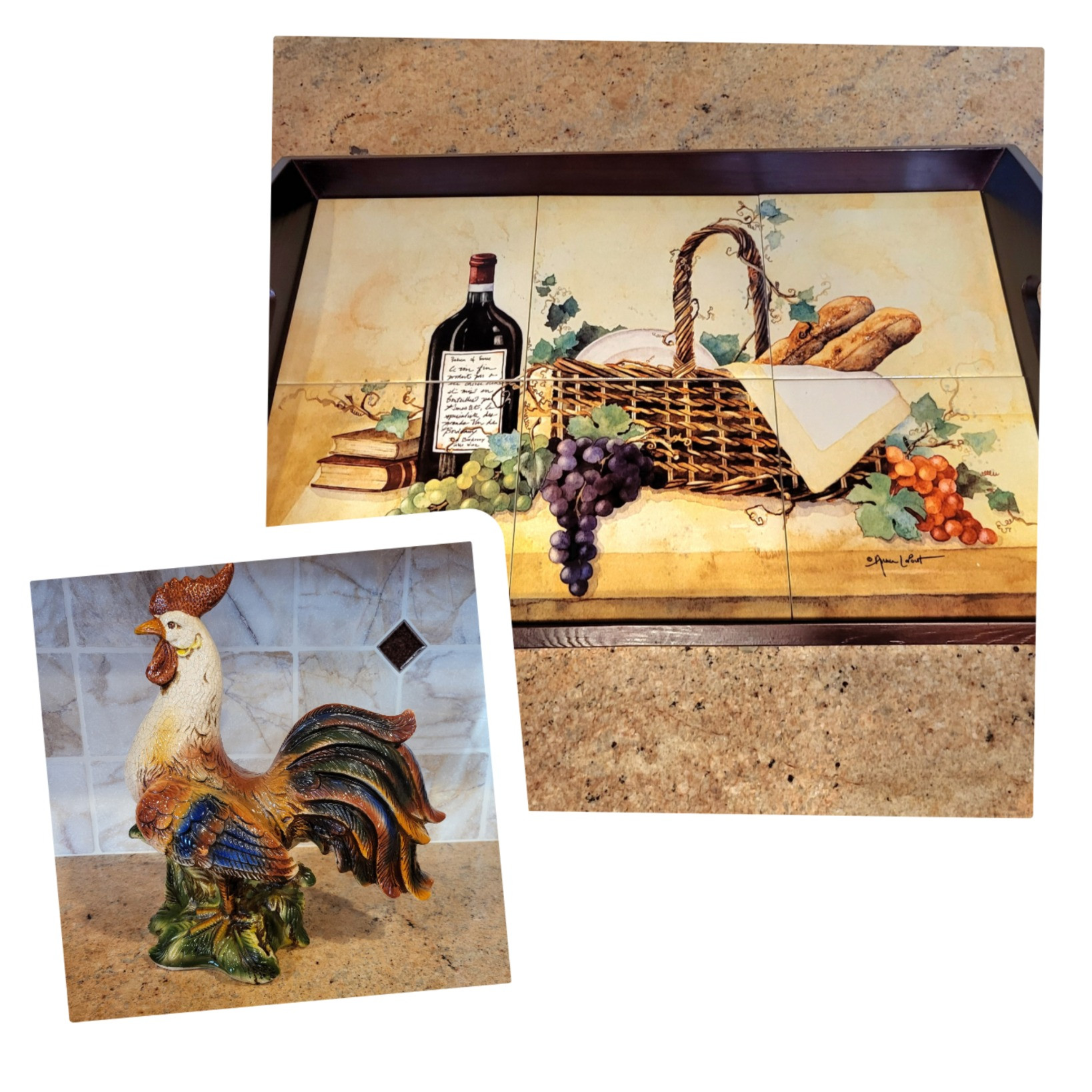 Anna LaPout, Italian tiled serving tray with handles, 20.5" L x 13.5" W. Ceramic rooster figurine 15" T x 12" L