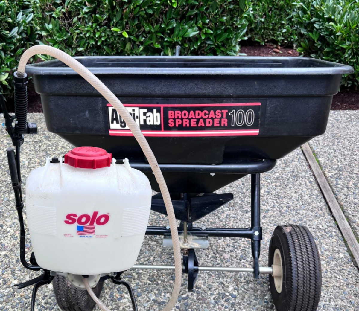 Agrifab Broadcast lawn and fertilizer spreader can cover an 1/3 acre due to its 100 lb capacity. Included in this lot is the SOLO backpack sprayer for fertilizer/pesticides.