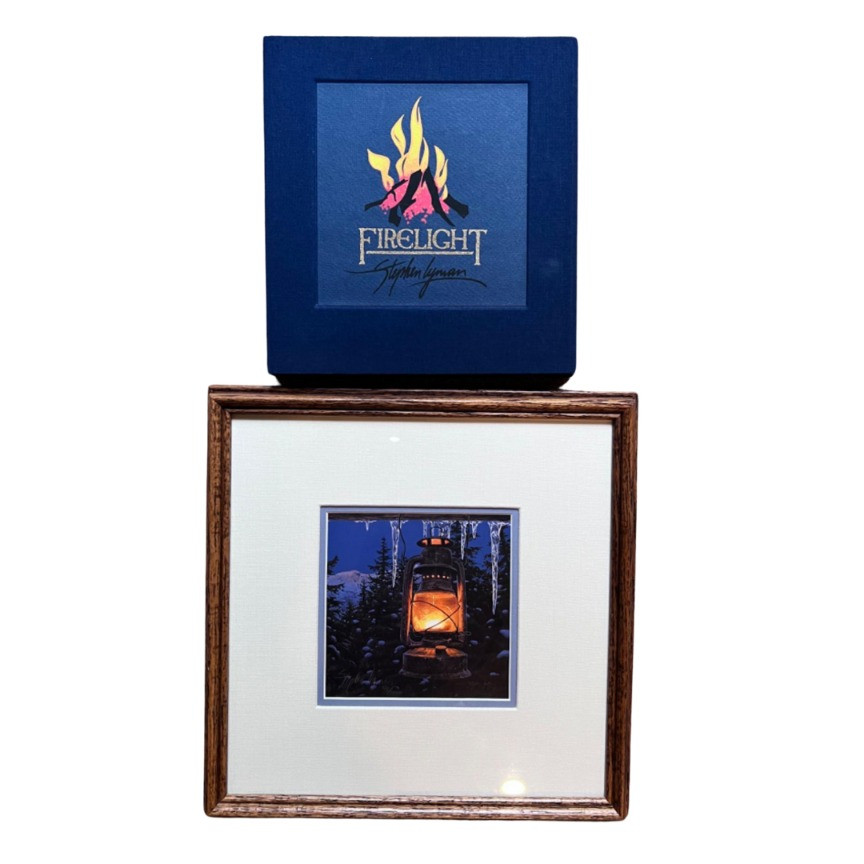 "Firelight" is a numbered lithograph that was inserted into a Chapbook by Stephen Lyman. The print is #9,811 of 10,000 and has been removed from where it was inserted in the book and framed. 14" x 14" Framed. Firelight is more than a book about art. Each page of the Chapbook, the artist guides you through Yosemite and shares the origins of both his campfire trilogy and his two mountain campfire prints. The journey is detailed in Lyman's writings, photographs, drawings, and sketches, some from Lyman's personal collection and some created especially for Firelight. Chapbooks are hand-assembled by craftsmen in a centuries-old tradition, making each volume of Firelight an individual work of art which can be treasured and proudly displayed. "Lantern Light" is included with the Firelight Chapbook.