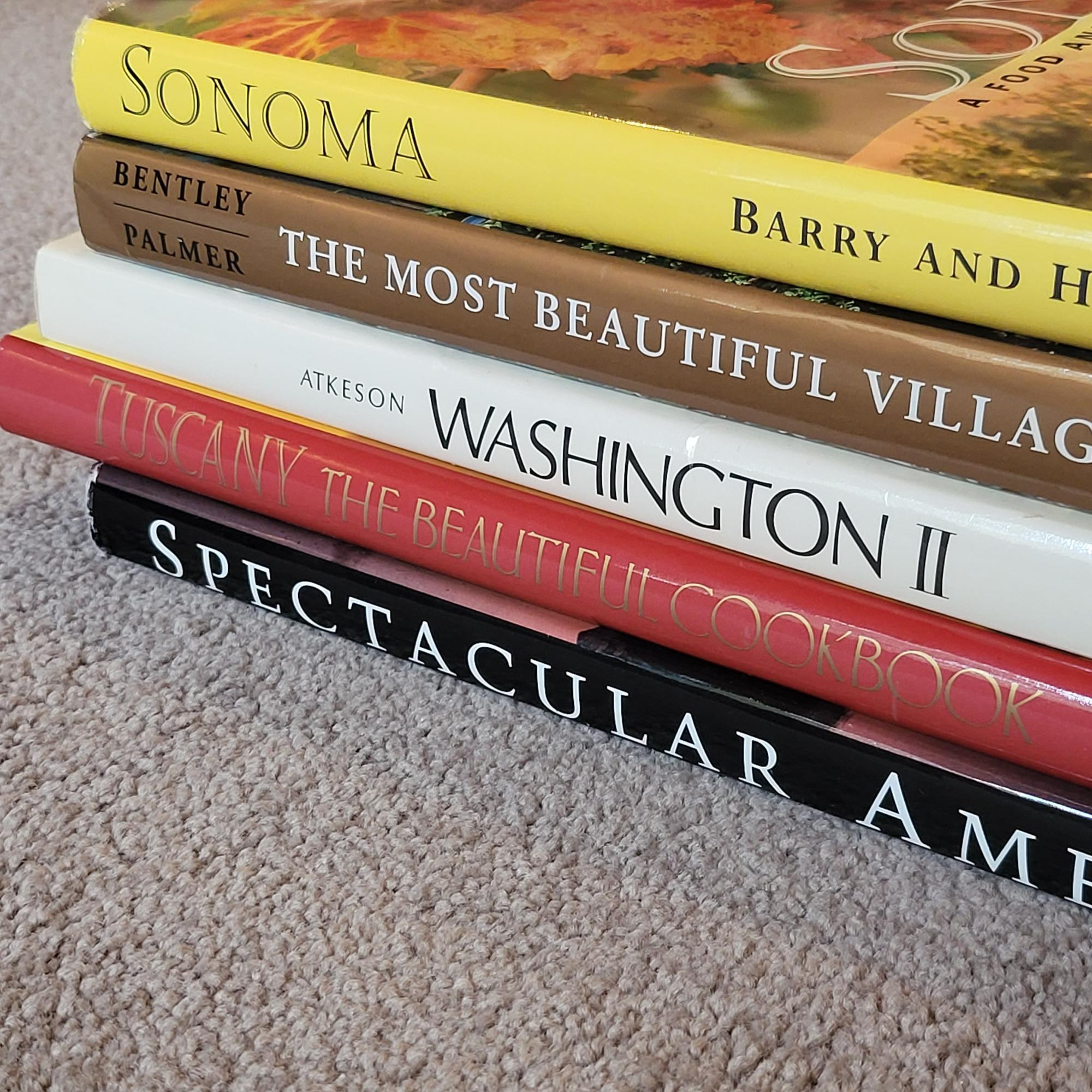 Tuscany Cookbook, Villages of Tuscany, Sonoma Food & Wine, Washington ll, Spectacular America. Book sizes range from 12" x 8.5 to 16" x12".