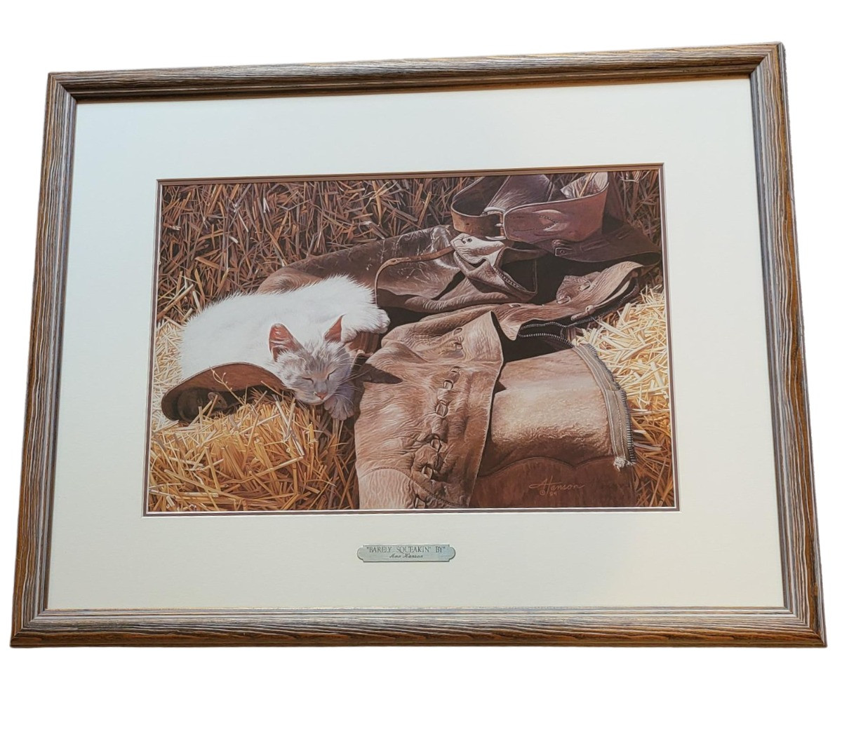 1994 limited edition print, wood framed, matted. 24.25" L x 18.5" T. Western themed, cat resting on a bale of hay. Comes with COA.