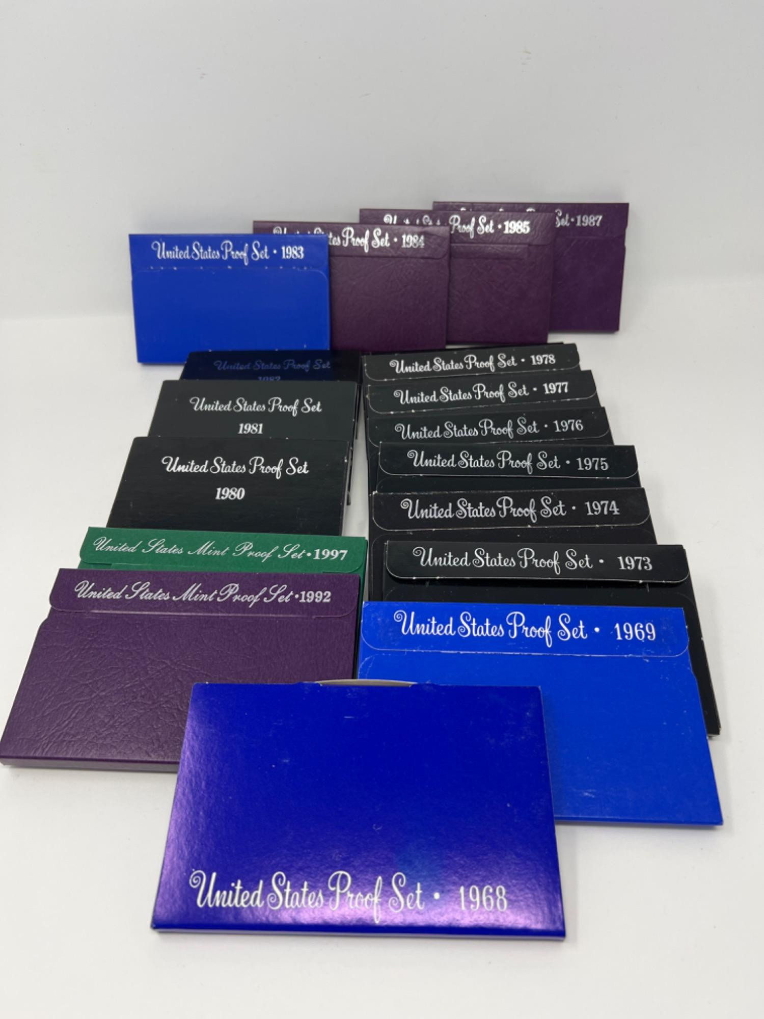 18 U.S. Five coin proof sets from years: 1968, 1969, 1973-1979, 1980, 1981, 1982, 1983, 1984, 1985, 1987, 1992, 1997