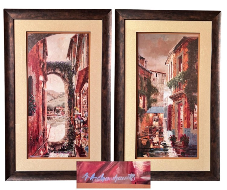 Two black framed impressionist prints of scenes in Venice, Italy. Warm and restful colors of rustic reds, light beige and dark browns, and burnt orange. Signed G. Archambault. Print size: 9 x 14