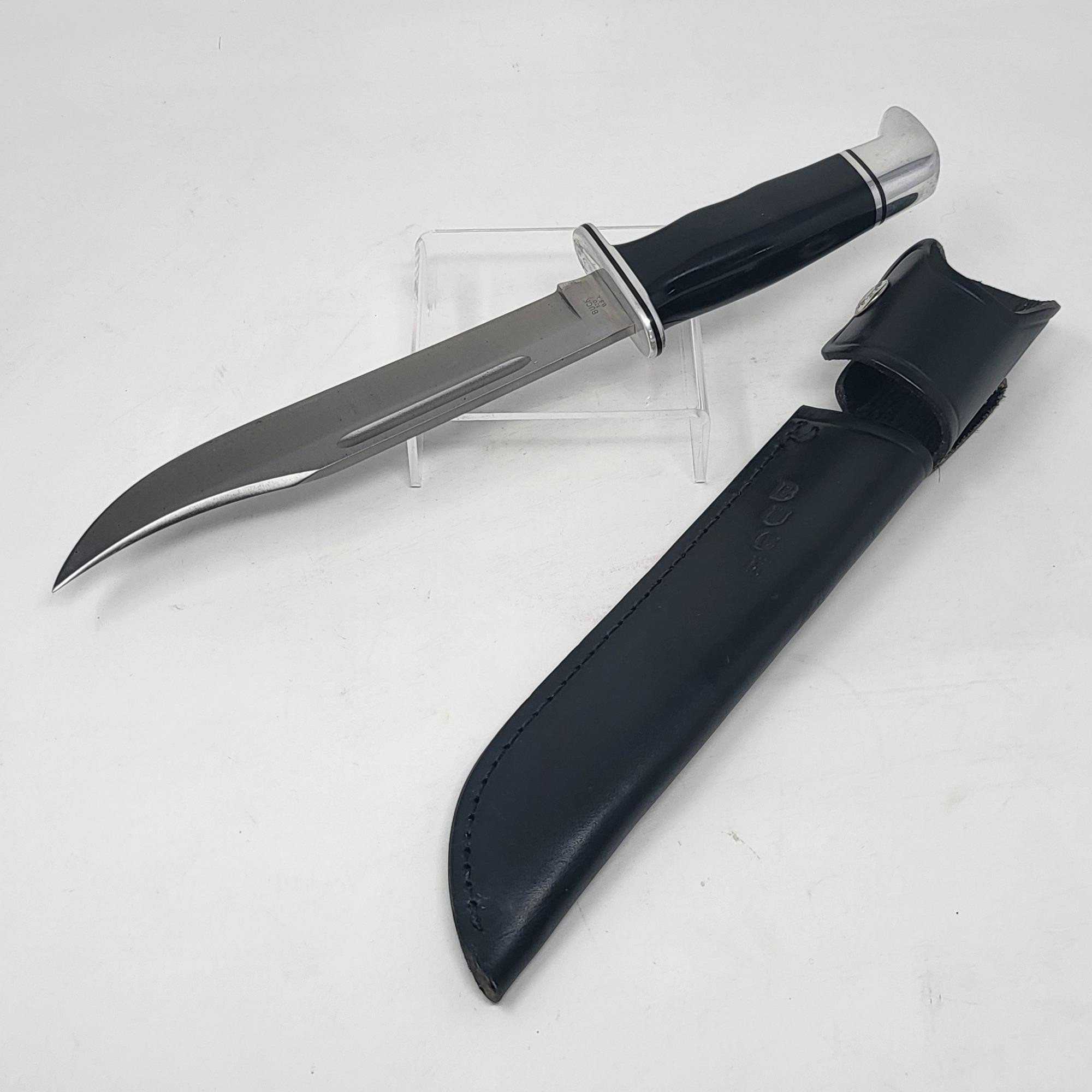 Buck 120 USA. 7.5" blade, 12" total length. Black leather sheath.