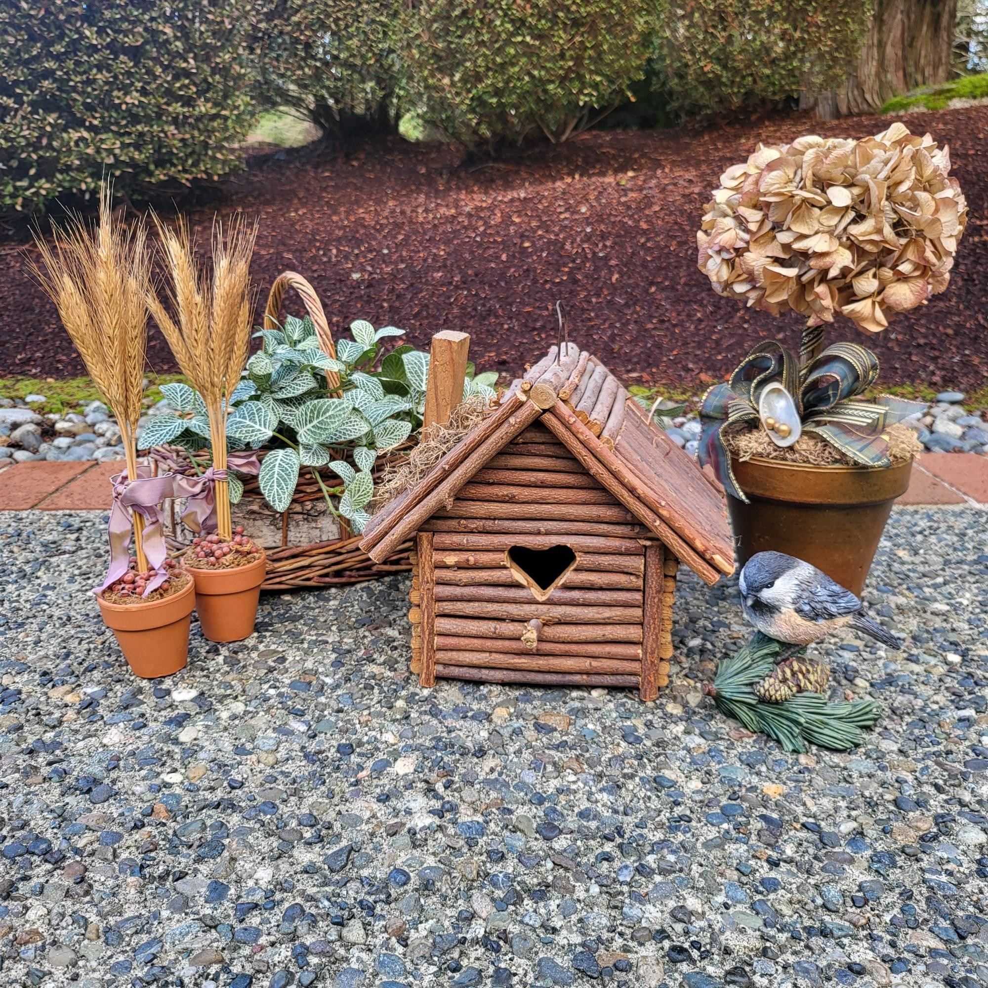 Adorable lifelike resin bird figure. Artificial hydrangea in pot, handmade twig birdhouse, artificial leaves bunch in wicker basket, two small pot artificial wheat.