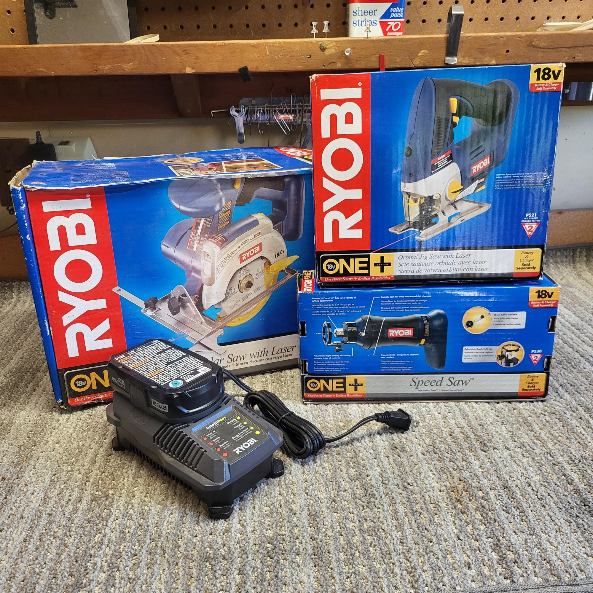 Lot # 143 - Ryobi One+ Circular Saw, Speed Saw, Jig Saw, Battery & Charger