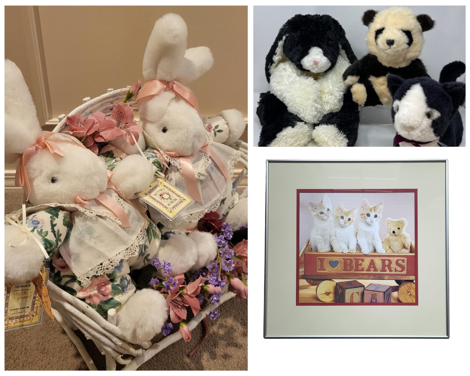 Mary Meyer black and white bunny has exceptionally soft long strand plush. Floppy ears and body. Tagged. Black and white cat by Gund. Mohair hard-stuffed panda bear (no tag) may be Steiff? Two Bunnies by the Bay in white wicker chair - Hutch Bunnies Sonia and Trudy. Numbered and with tags. Three kittens and bear in a I LOVE BEARS wagon framed print. 18" x 18".