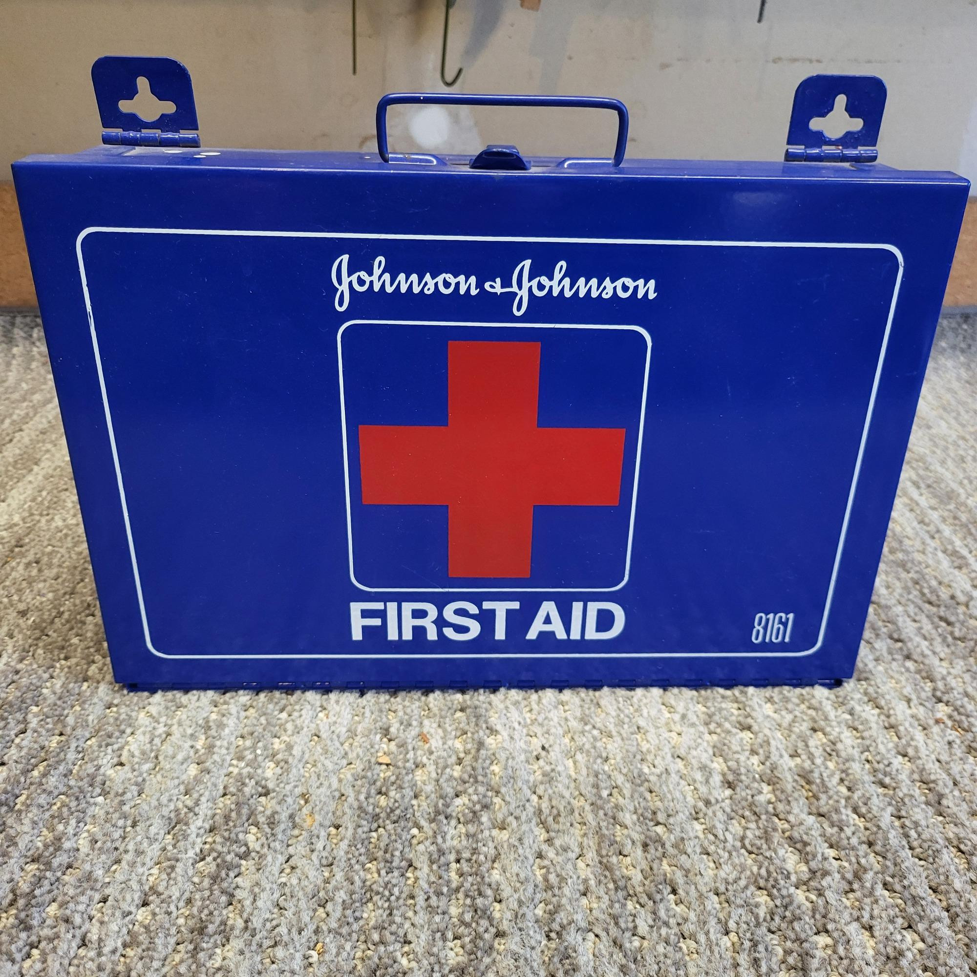 Vintage Johnson and Johnson blue metal First Aid box with wall mount and contents and First Aid Guide. It measures 10.5" x 7.5" x 2.5" . It has a folding hinge lid.