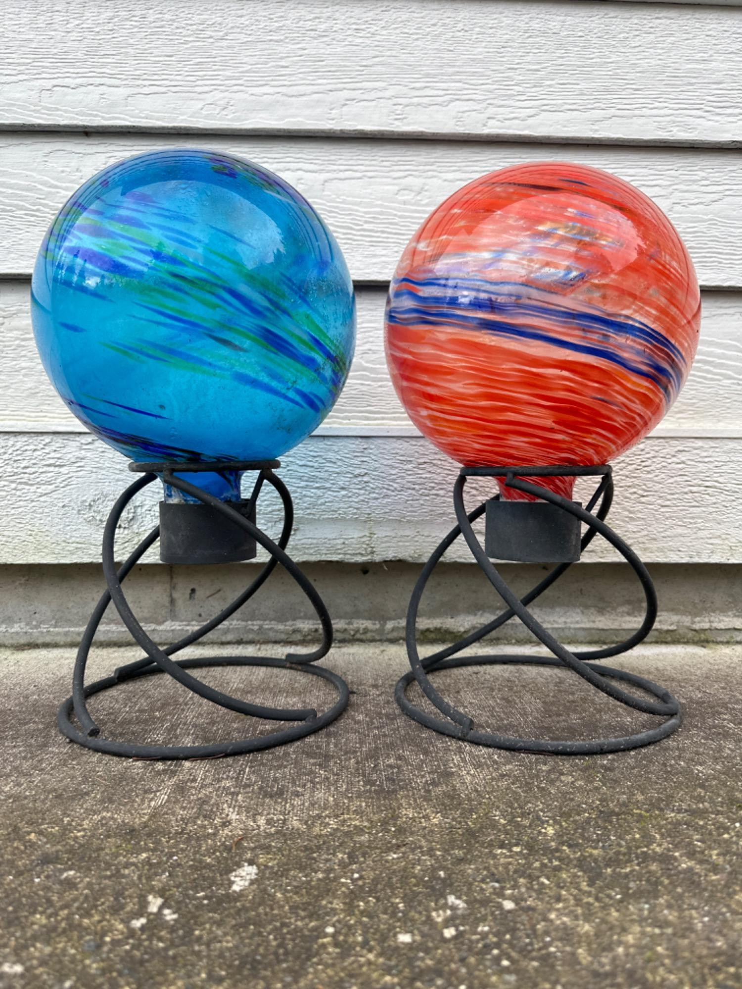 Blown Glass Ball/Orbs w/ Stands. Please note photos, the blue one has been repaired.