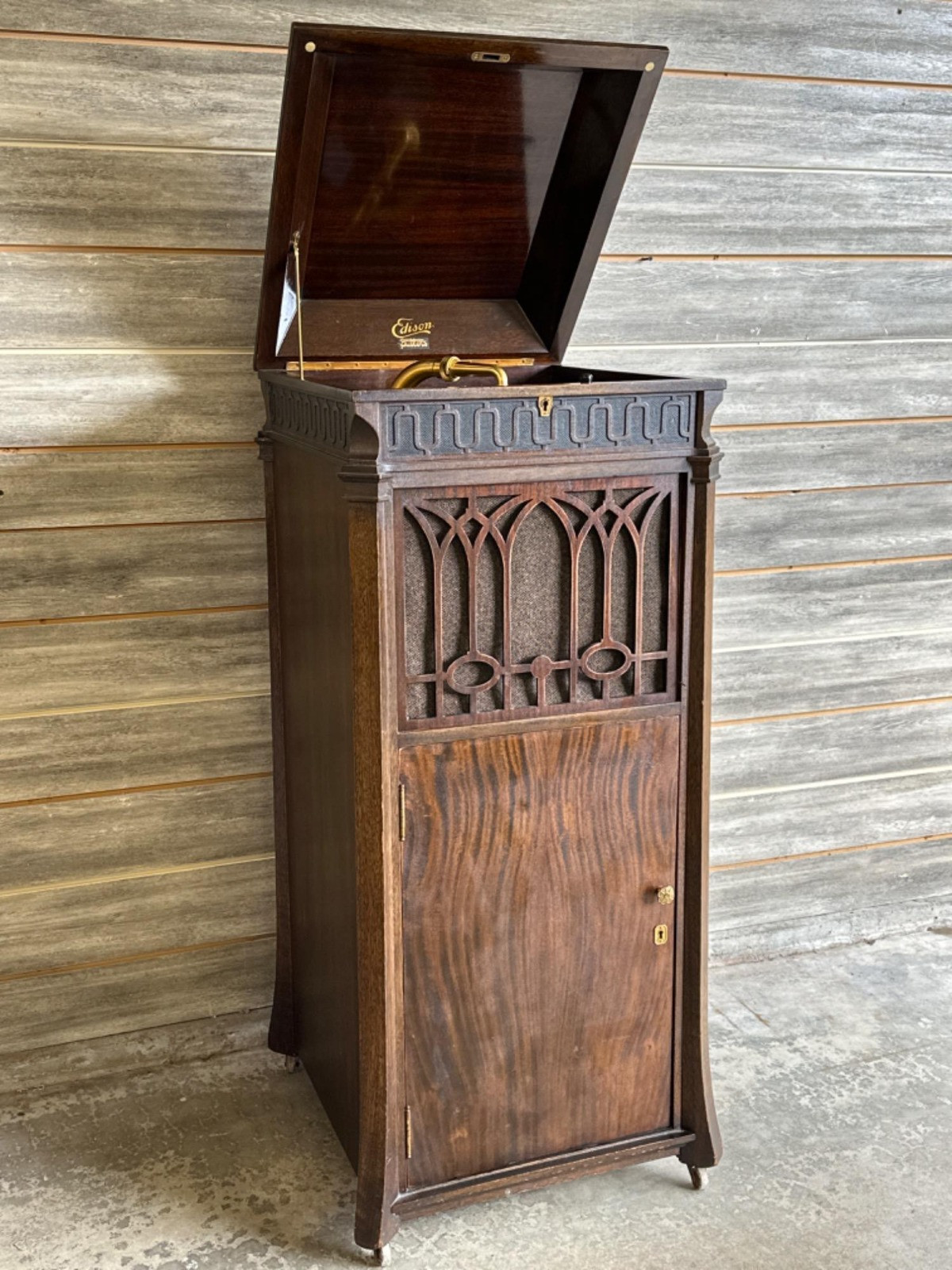 Antique Oak 1919 Edison Chippendale Diamond C19 Phonograph w/ Records YES IT WORKS!!! *wear typical and expected for age Thomas Edison is credited with the invention of the cylinder phonograph, which used a copper cylinder wrapped in tinfoil to record and reproduce sound. Chichester Bell and other inventors followed Edison and made various improvements to the phonograph: They developed better sound quality by waxing a thick strip of cylindrical paper to create the phonograph record. In 1887, the German-born American inventor Emile Berliner introduced a spiral grove on a flat rotating disc. He called his invention the gramophone. This Edison Official Laboratory Model C-19 “Chippendale” was manufactured as the most luxurious model of gramophone designed for use with longitudinal vibration disc records. To demonstrate its quality, Edison once substituted a recording played on this gramophone for a human opera singer in the middle of a live performance, yet the audience, it is said, did not realize the sound had been switched from a real human voice to the gramophone’s performance.