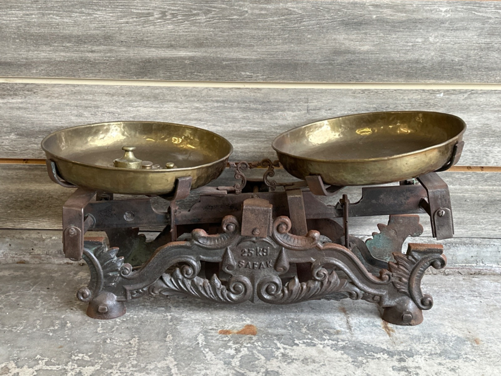 Antique Art Nouveau Cast Iron Scale & Brass(?) Dishes - Early 1900's Unsure of working condition. Includes brass weights and appears to be additional pieces for scale?