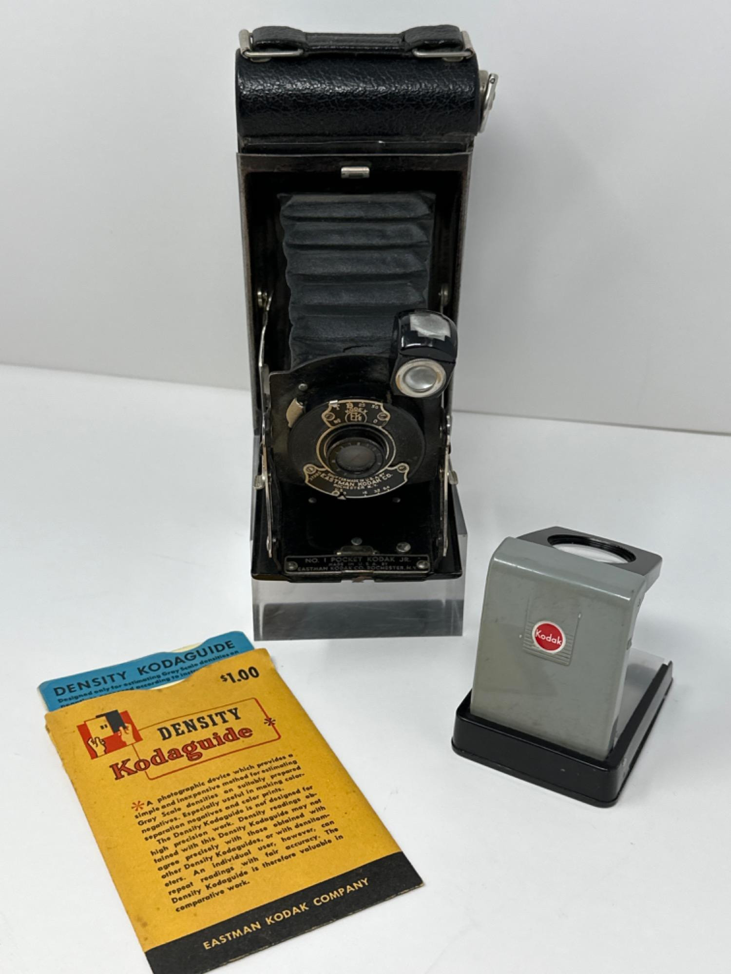 Vintage Kodak Camera Pocket Jr- 1 Kodak Autographic Junior was a folding camera for 120 film (6x9 cm). It was introduced in 1914, replacing the No. 1 Kodak Junior. The Autographic version added a window on the back in which the user could write notes on the film using a metal stylus.