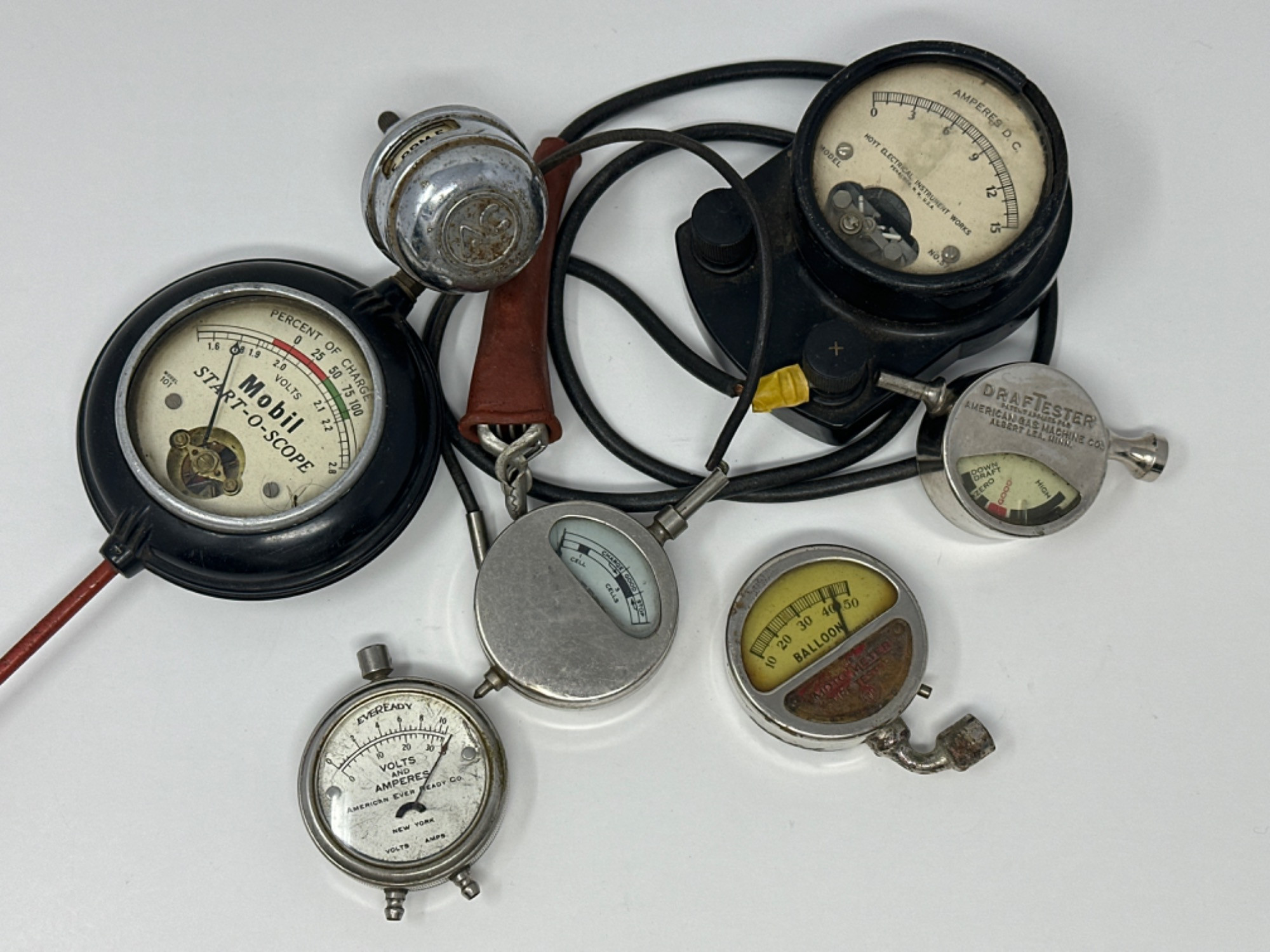 Eveready Volt and Amperes gauge Motometer tire tester Hoyt Amperes gauge DrafTester Mobil Stret-O-Scope Rpm gauge