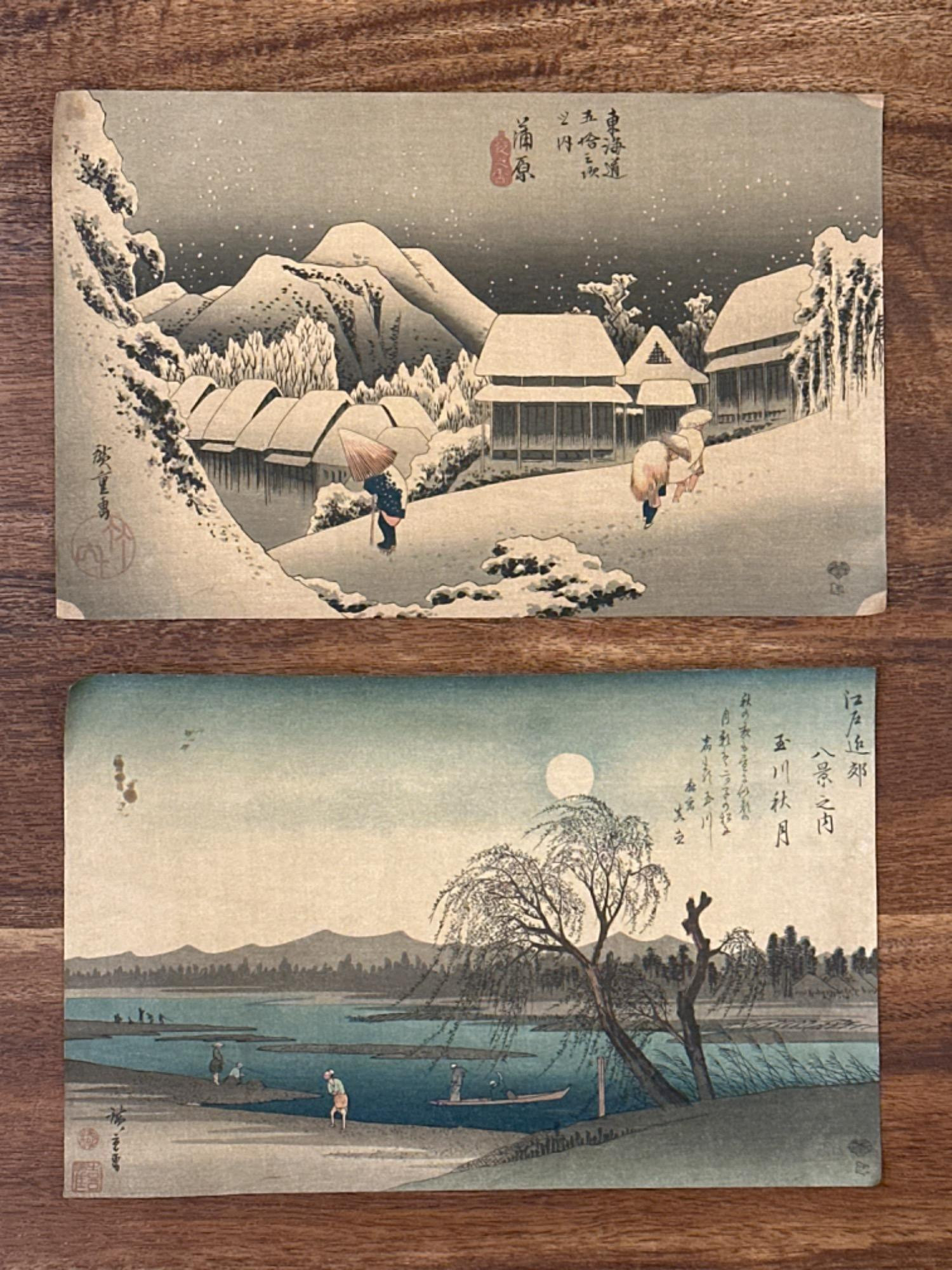 Utagawa Hiroshige 1800's Japanese Wood Block Prints- Please photos carefully for more details. These prints seem older- unsure of age. Thin paper. Could be framed. Taken from Wikipedia- Hiroshige is best known for his horizontal-format landscape series The Fifty-three Stations of the Tōkaidō and for his vertical-format landscape series One Hundred Famous Views of Edo. The subjects of his work were atypical of the ukiyo-e genre, whose typical focus was on beautiful women, popular actors, and other scenes of the urban pleasure districts of Japan's Edo period (1603–1868). The popular series Thirty-six Views of Mount Fuji by Hokusai was a strong influence on Hiroshige's choice of subject, though Hiroshige's approach was more poetic and ambient than Hokusai's bolder, more formal prints. Subtle use of color was essential in Hiroshige's prints, often printed with multiple impressions in the same area and with extensive use of bokashi (color gradation), both of which were rather labor-intensive techniques. For scholars and collectors, Hiroshige's death marked the beginning of a rapid decline in the ukiyo-e genre, especially in the face of the westernization that followed the Meiji Restoration of 1868. Hiroshige's work came to have a marked influence on western European painting towards the close of the 19th century as a part of the trend in Japonism. Western European artists, such as Manet and Monet, collected and closely studied Hiroshige's compositions: Vincent van Gogh, for instance, painted copies of some Hiroshige prints.