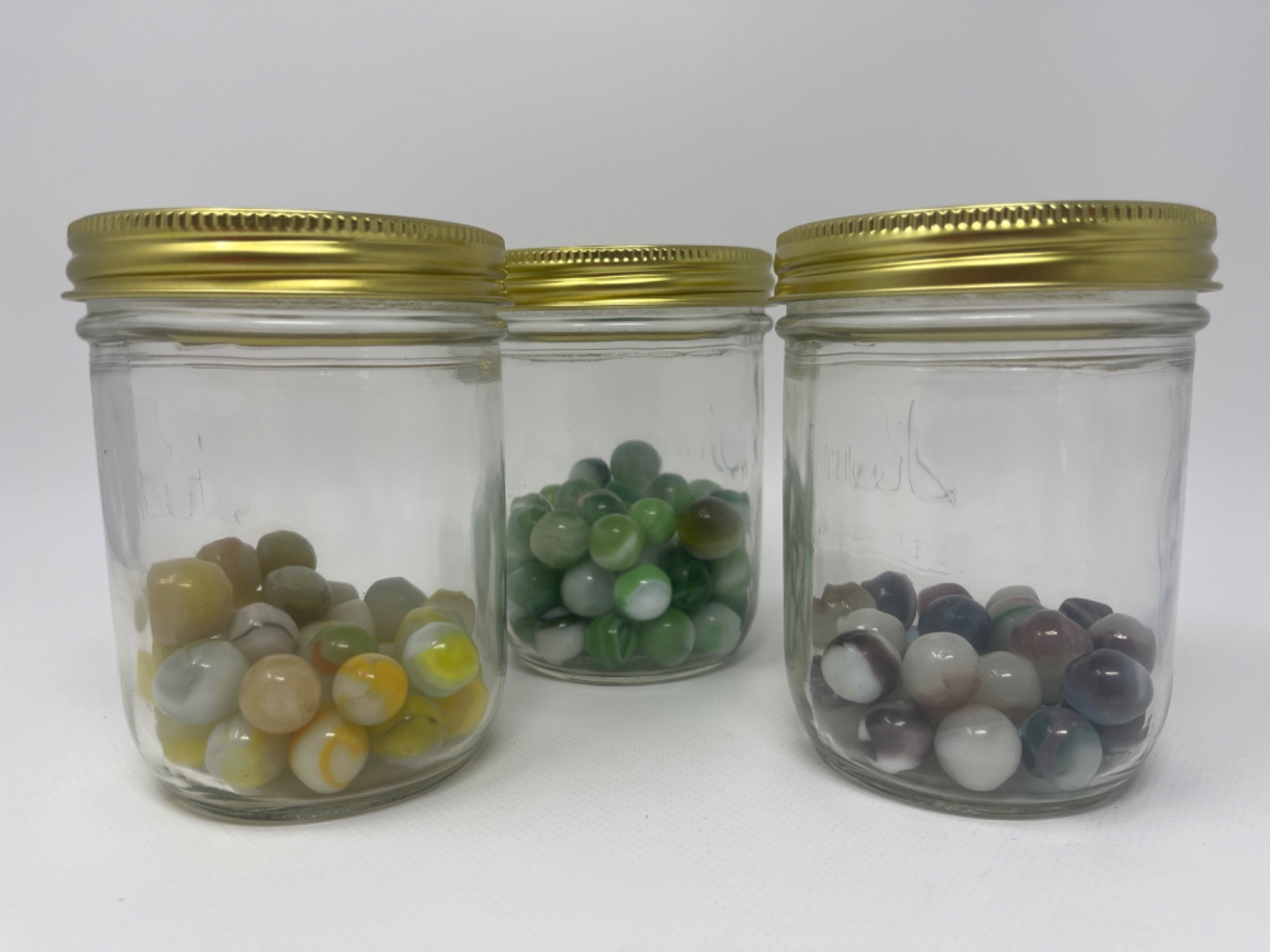 Vintage Purple, Yellow & Green Marbles Come in wide mouth Kerr glass jars