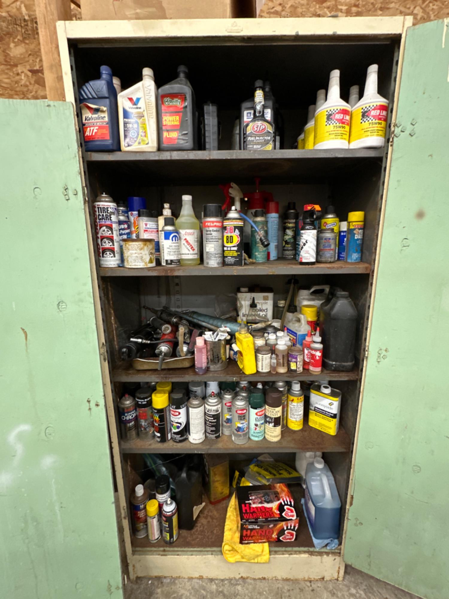 Lot # 52 - Mechanic's Dream! Cabinet Full of Oils & Such Like