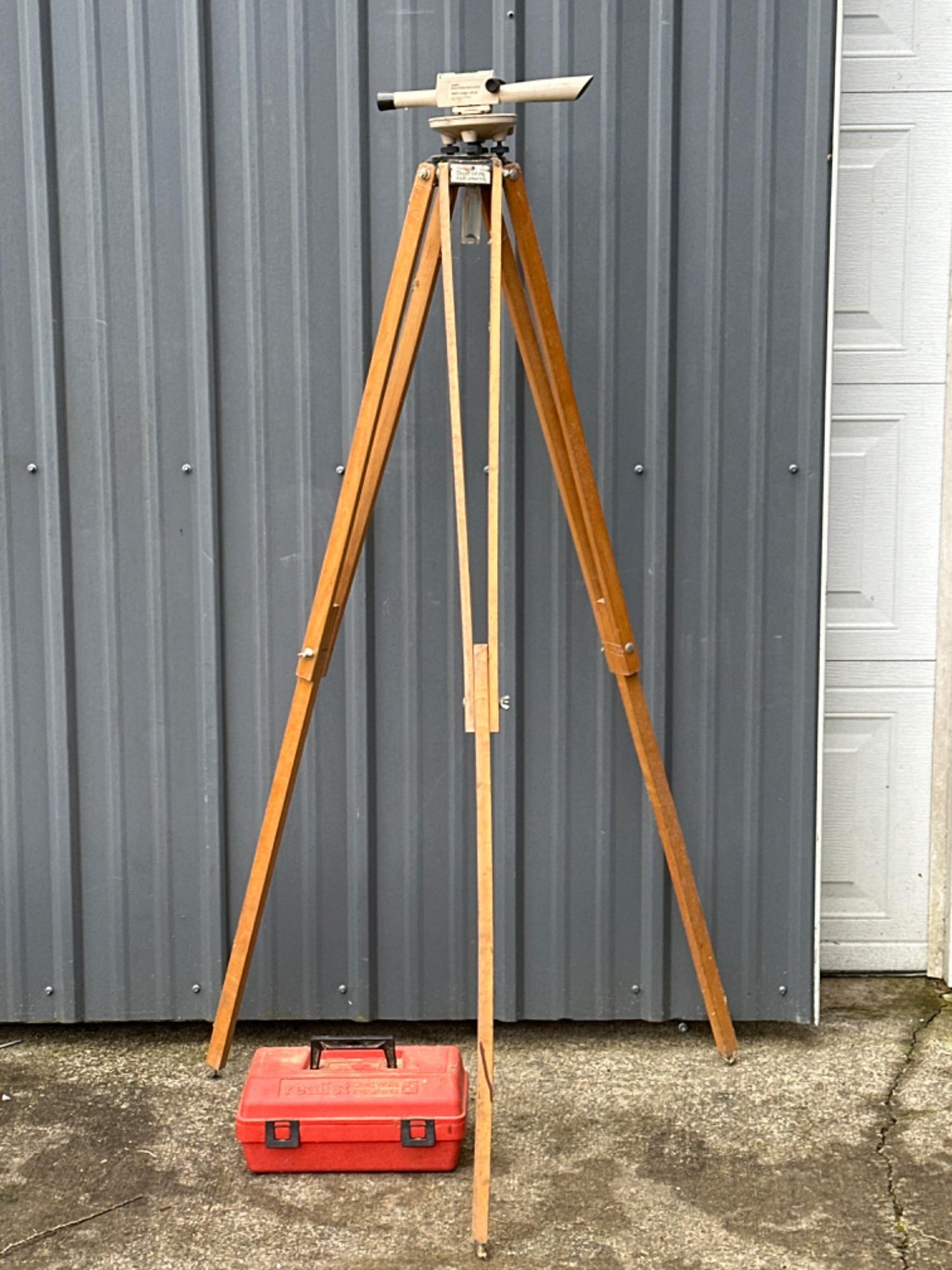 Realist David White Instruments Sight Level LP6-20 & Vintage Wooden Stand 59” H Consists of the stand and red carrying case for the sight (separates from stand) Needs good cleaning