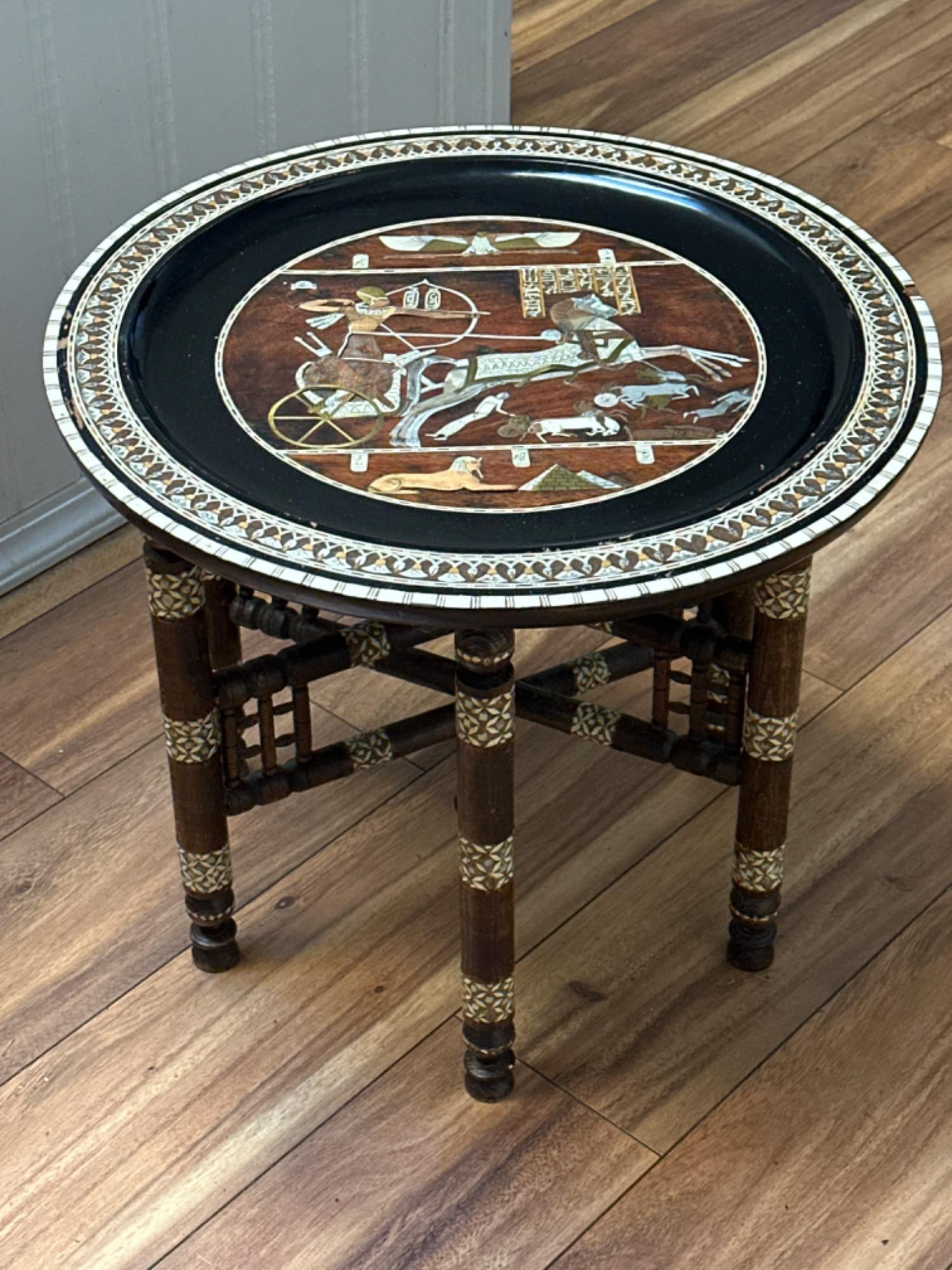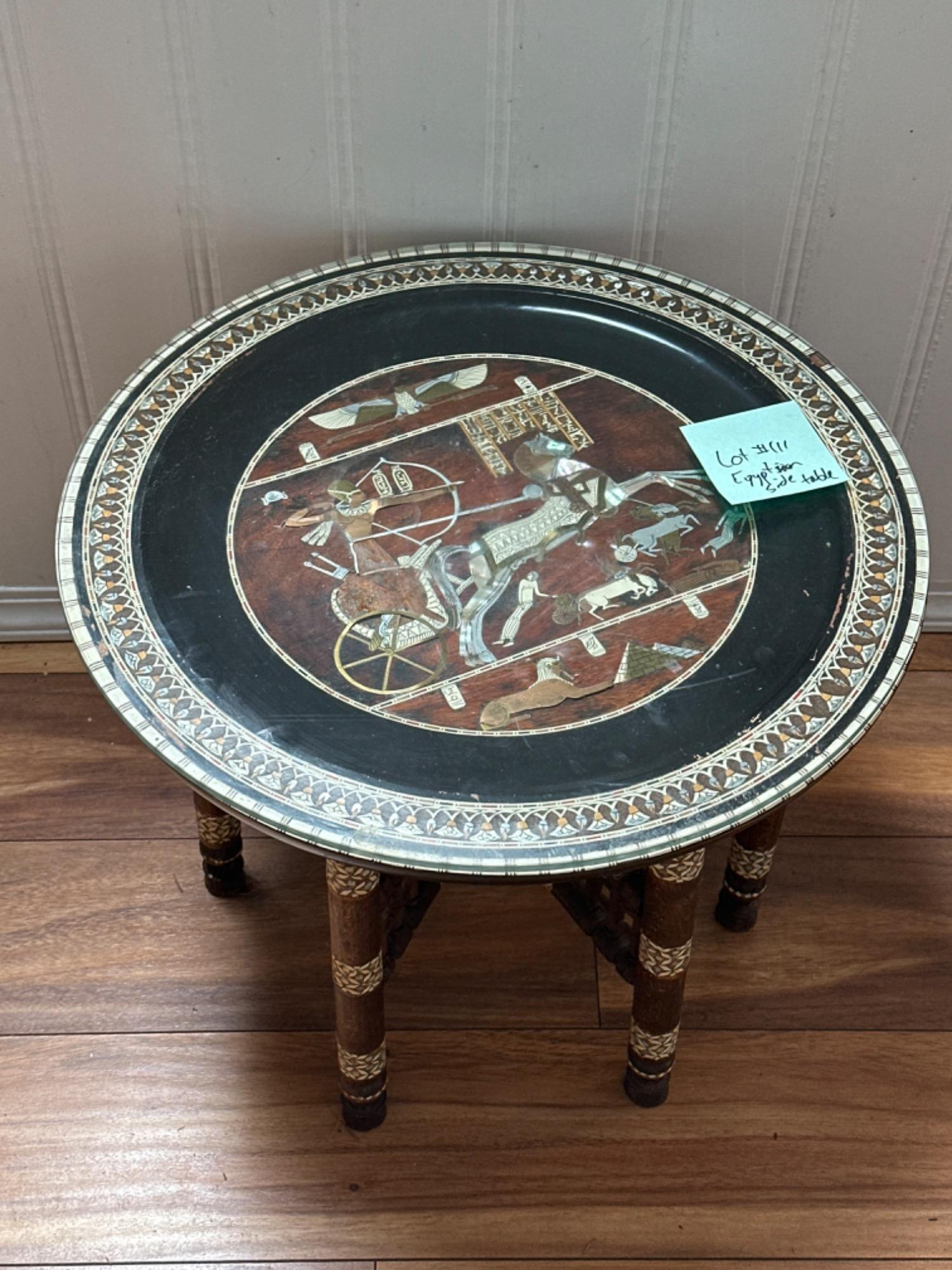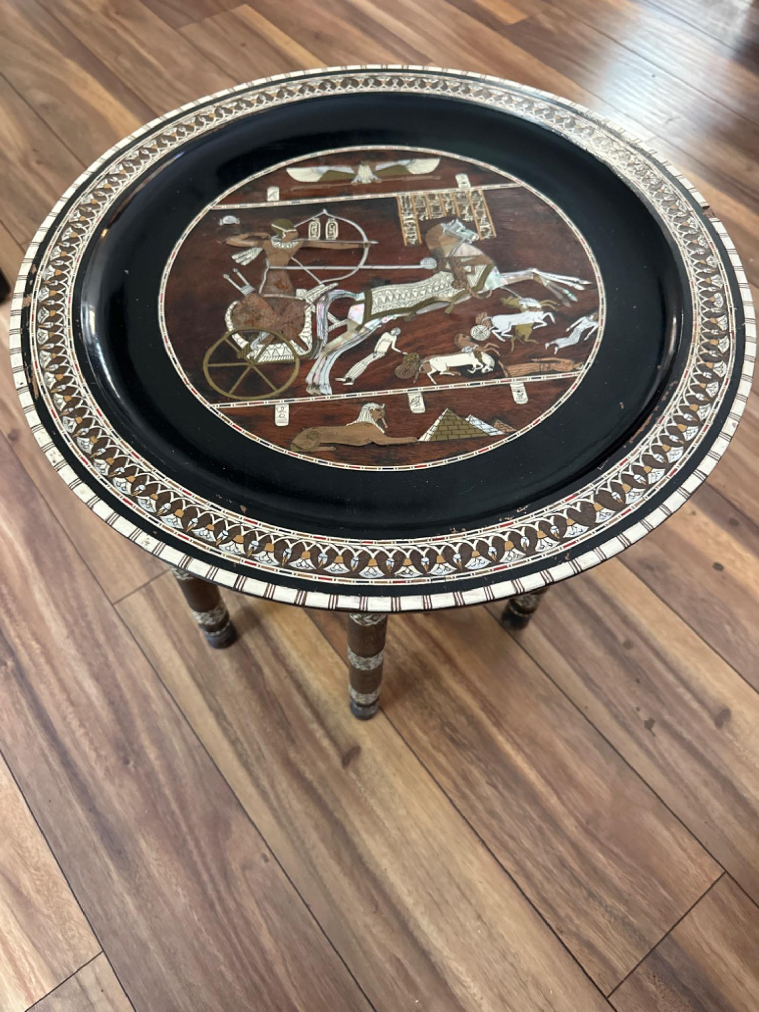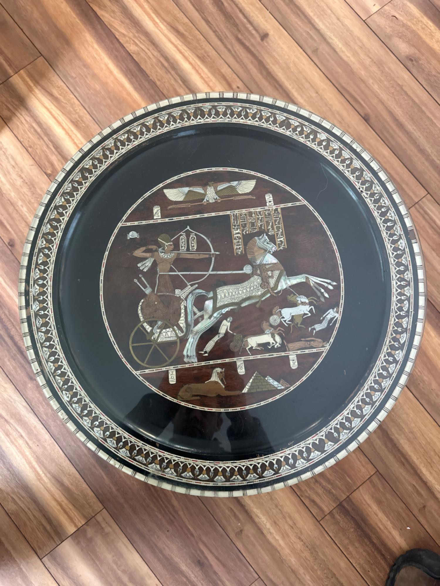 The Egyptian side table measures approximately 20 inches wide by 16 1/2 inches tall Needs wiped down. Glass removable top, and the table top itself removes from table legs. One bone inlay around edge is missing.