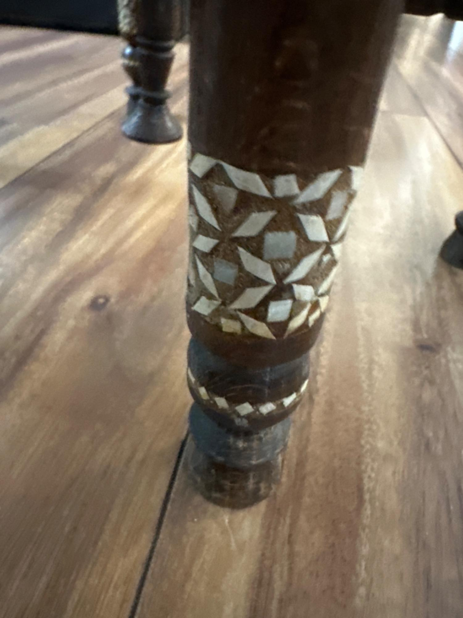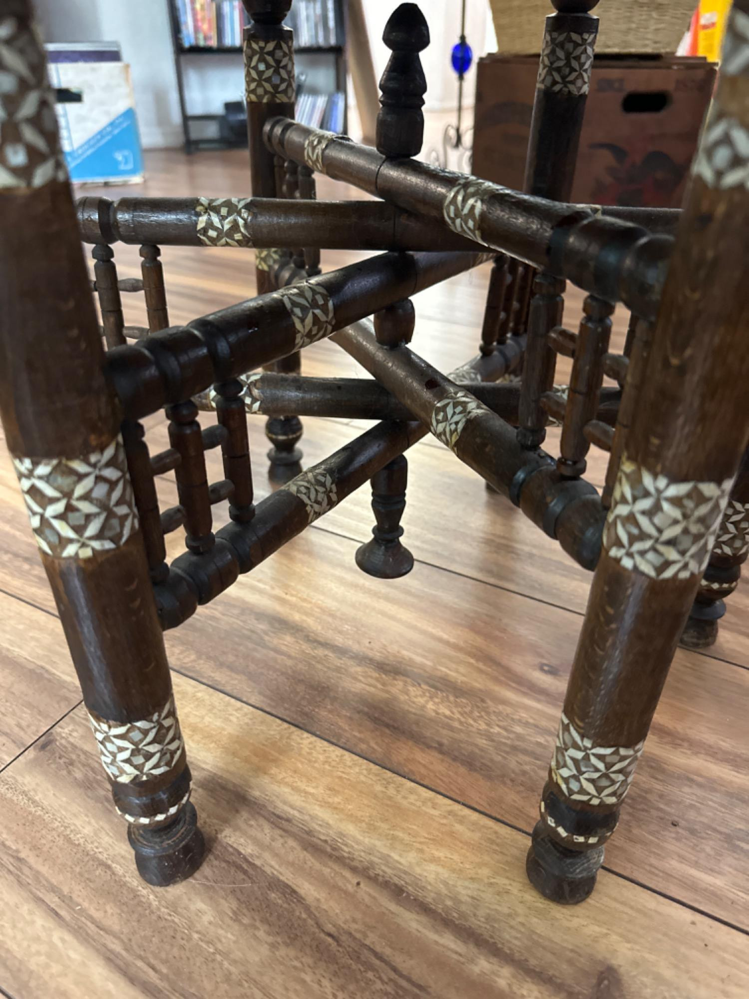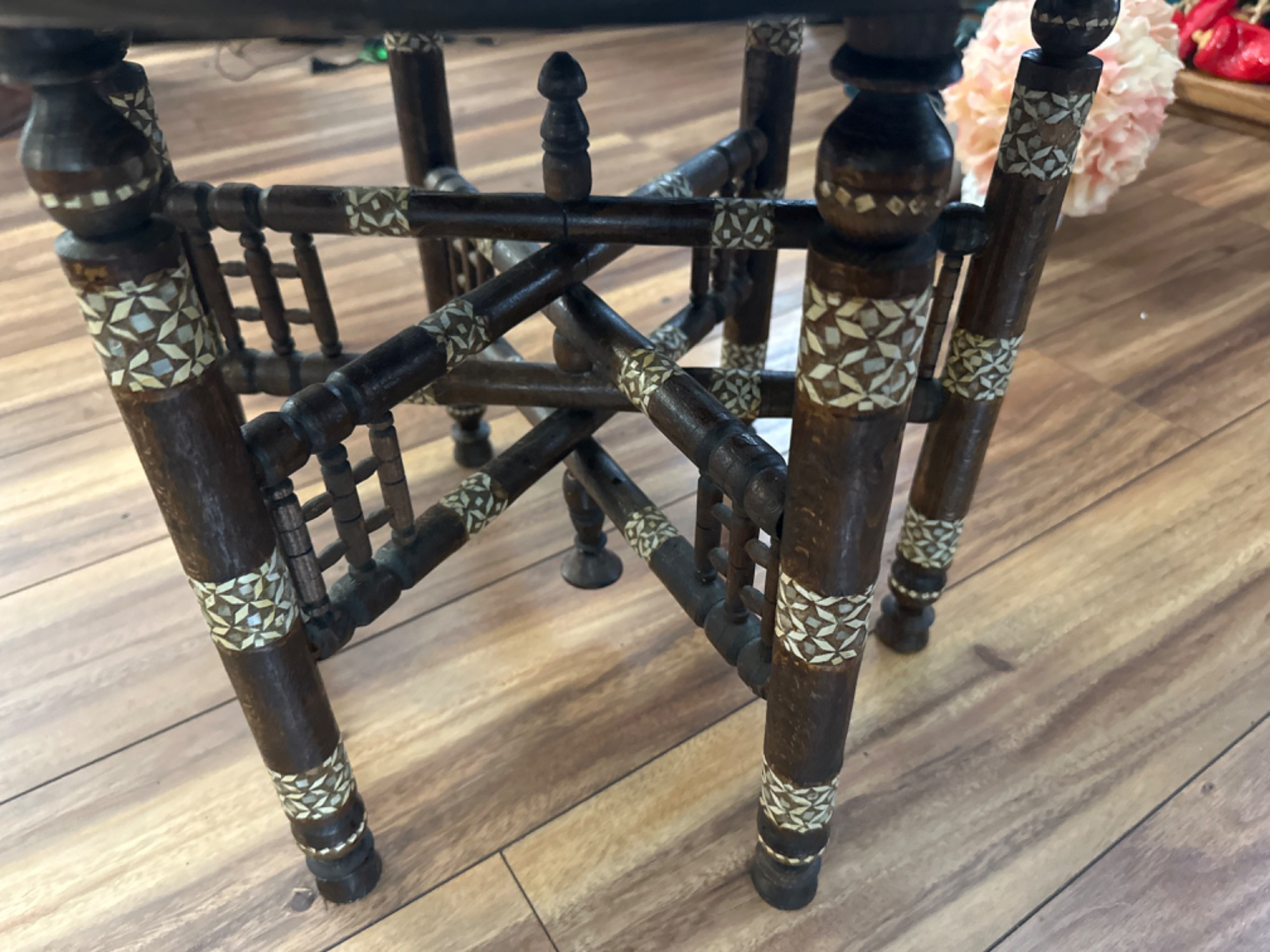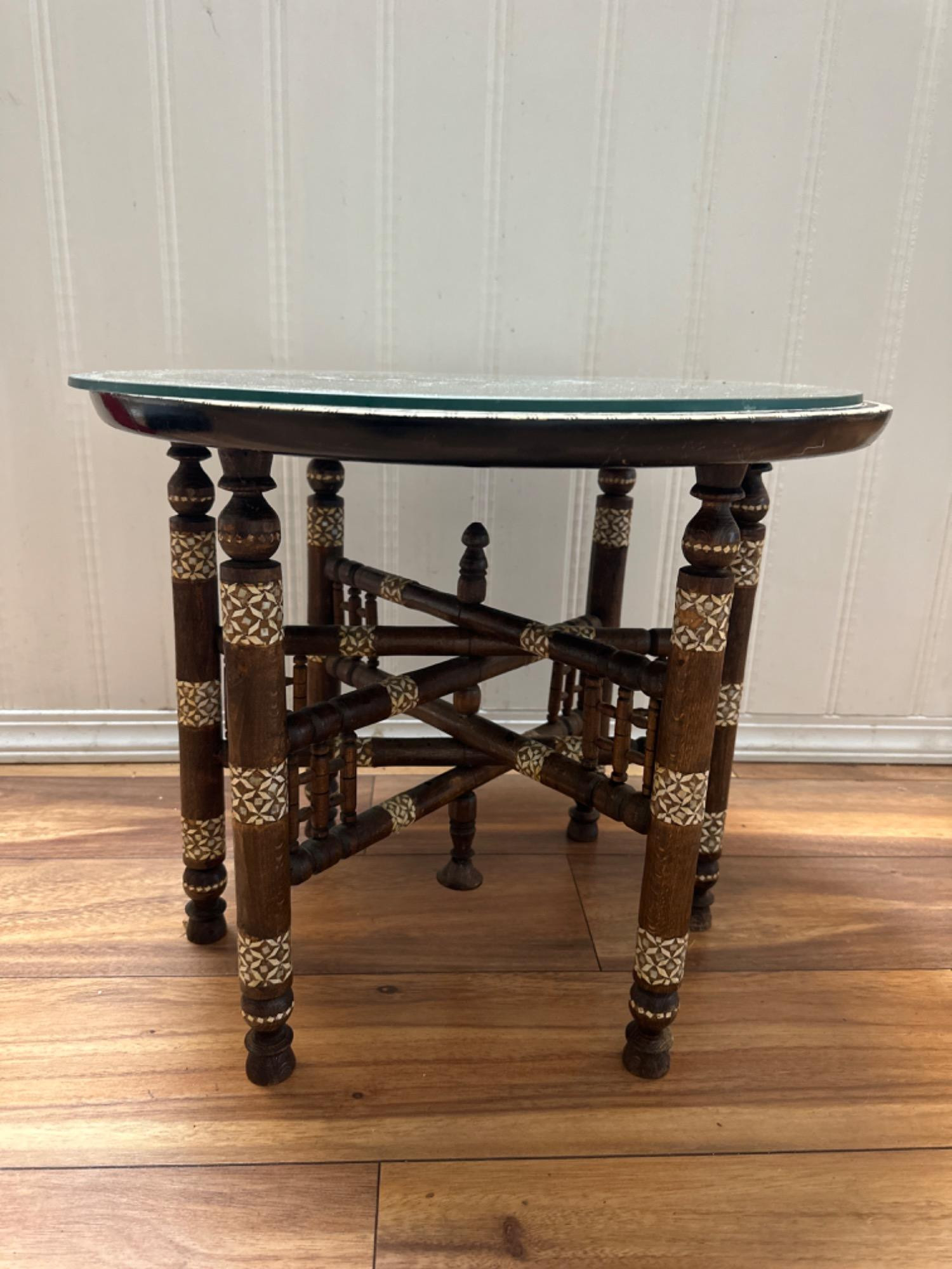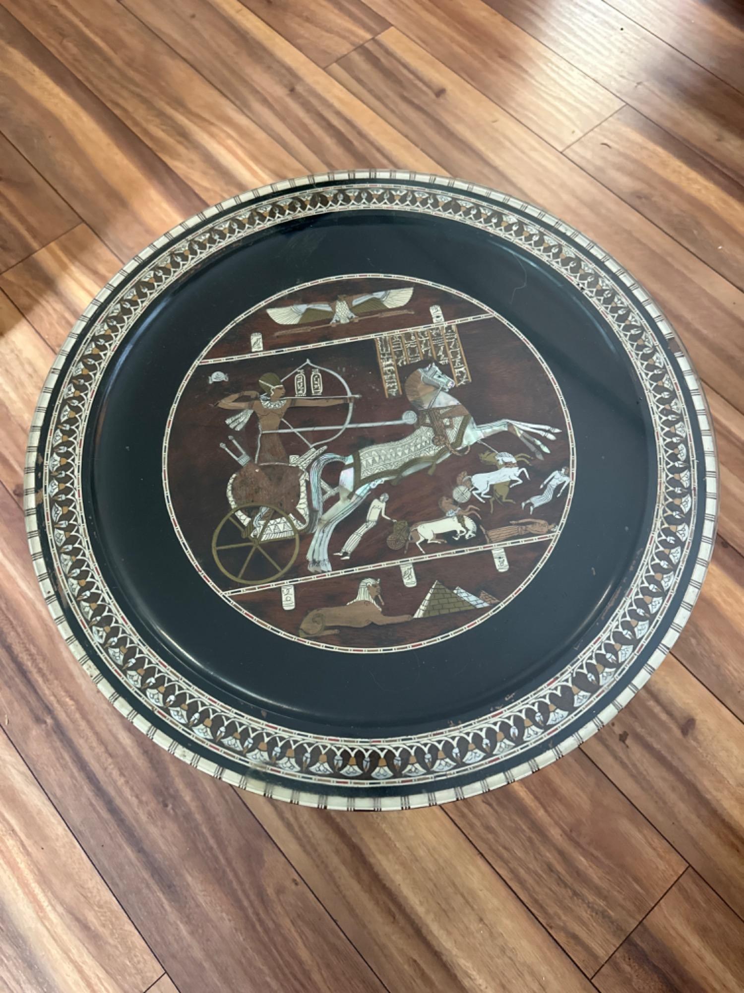 The Egyptian side table measures approximately 20 inches wide by 16 1/2 inches tall Needs wiped down. Glass removable top, and the table top itself removes from table legs. One bone inlay around edge is missing.