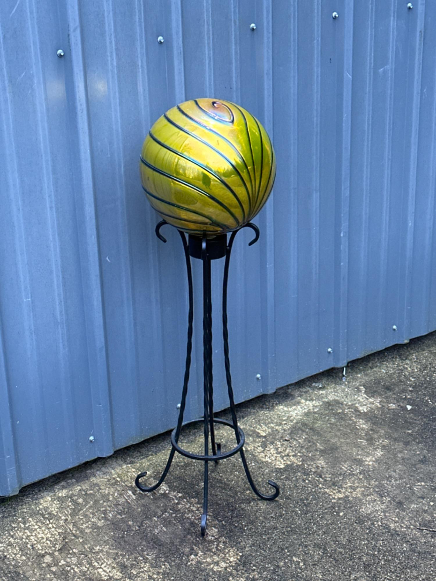 Iridescent Blown Glass Orb on Metal Stand 34” H x 8” W