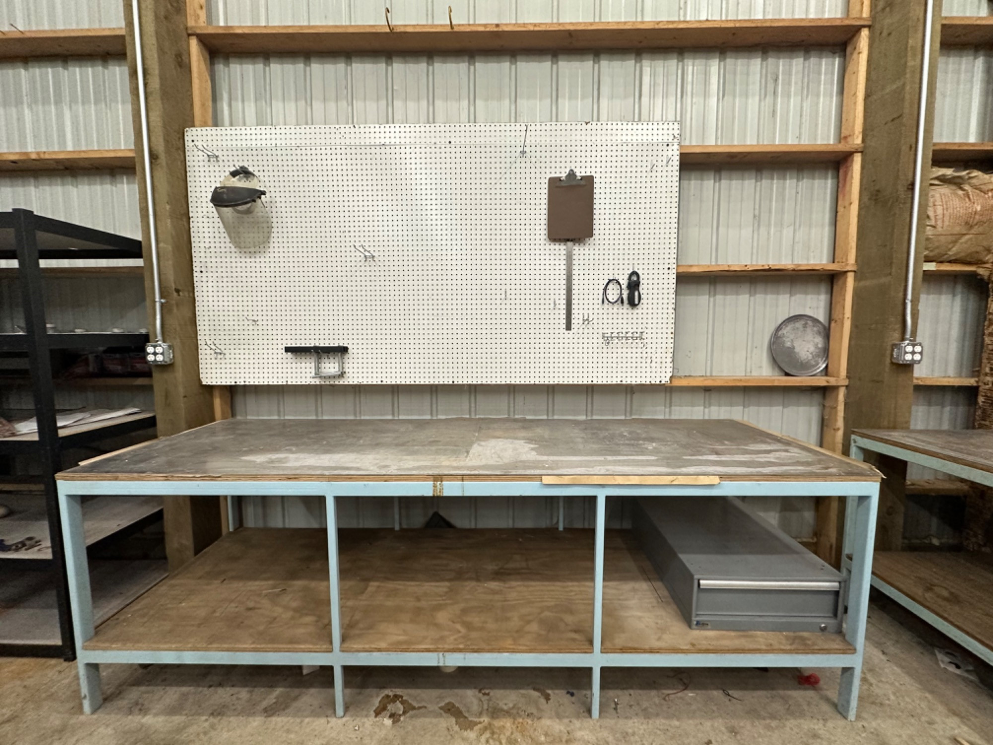 Large Metal Workbench/Table Table Top: 5/8" plywood & approx. 1/4" Aluminum Sheet Vintage, well used condition
