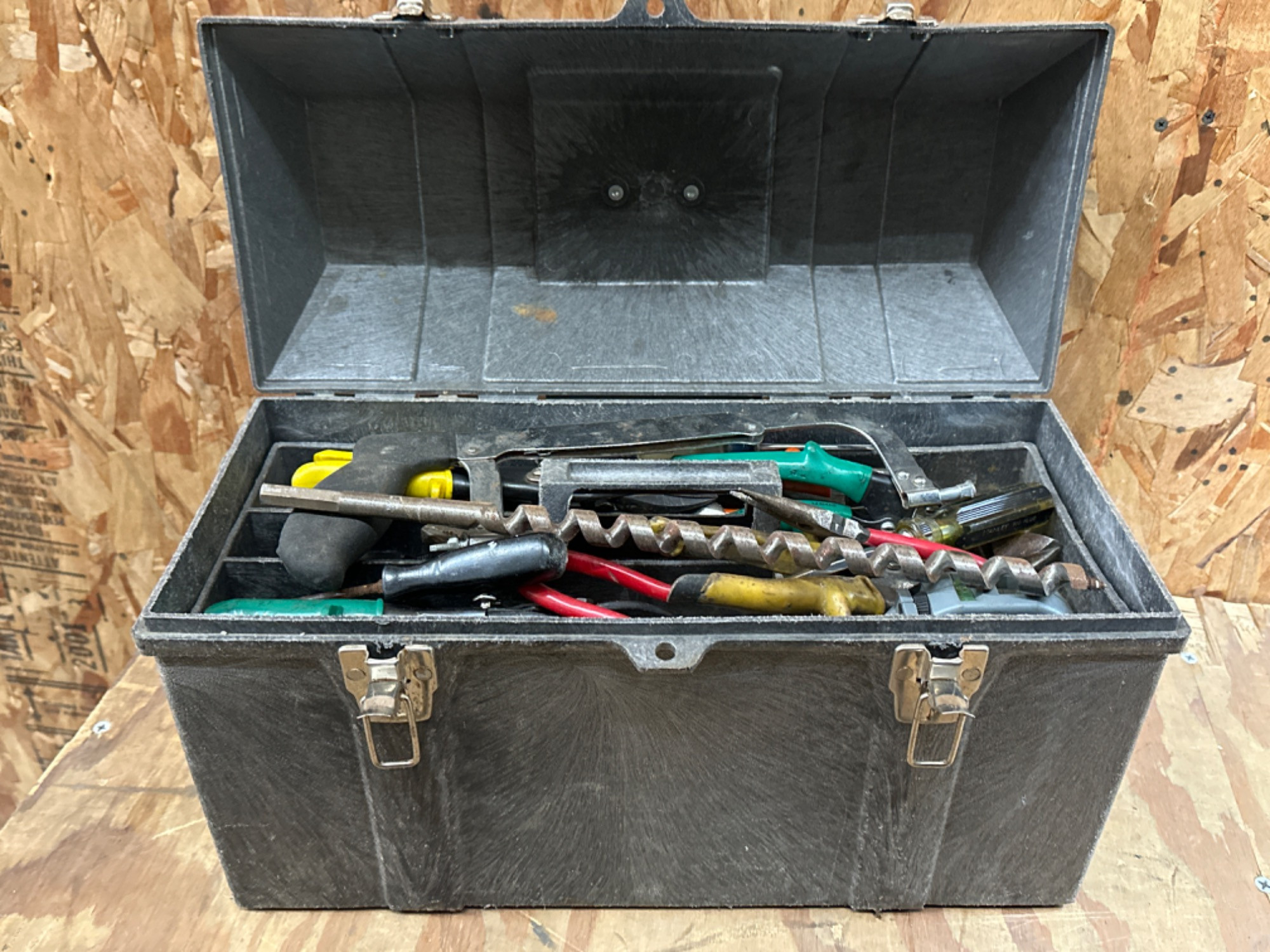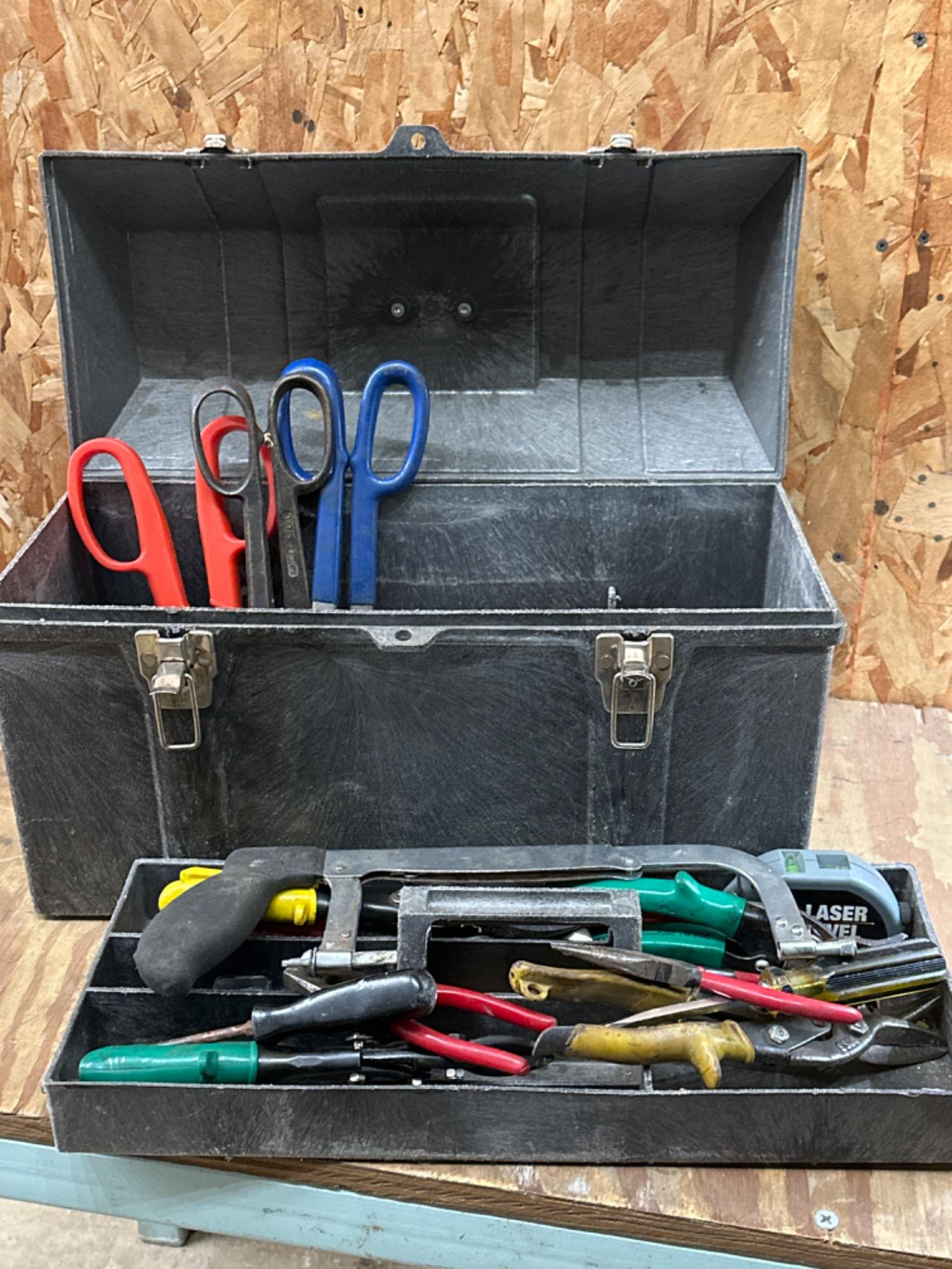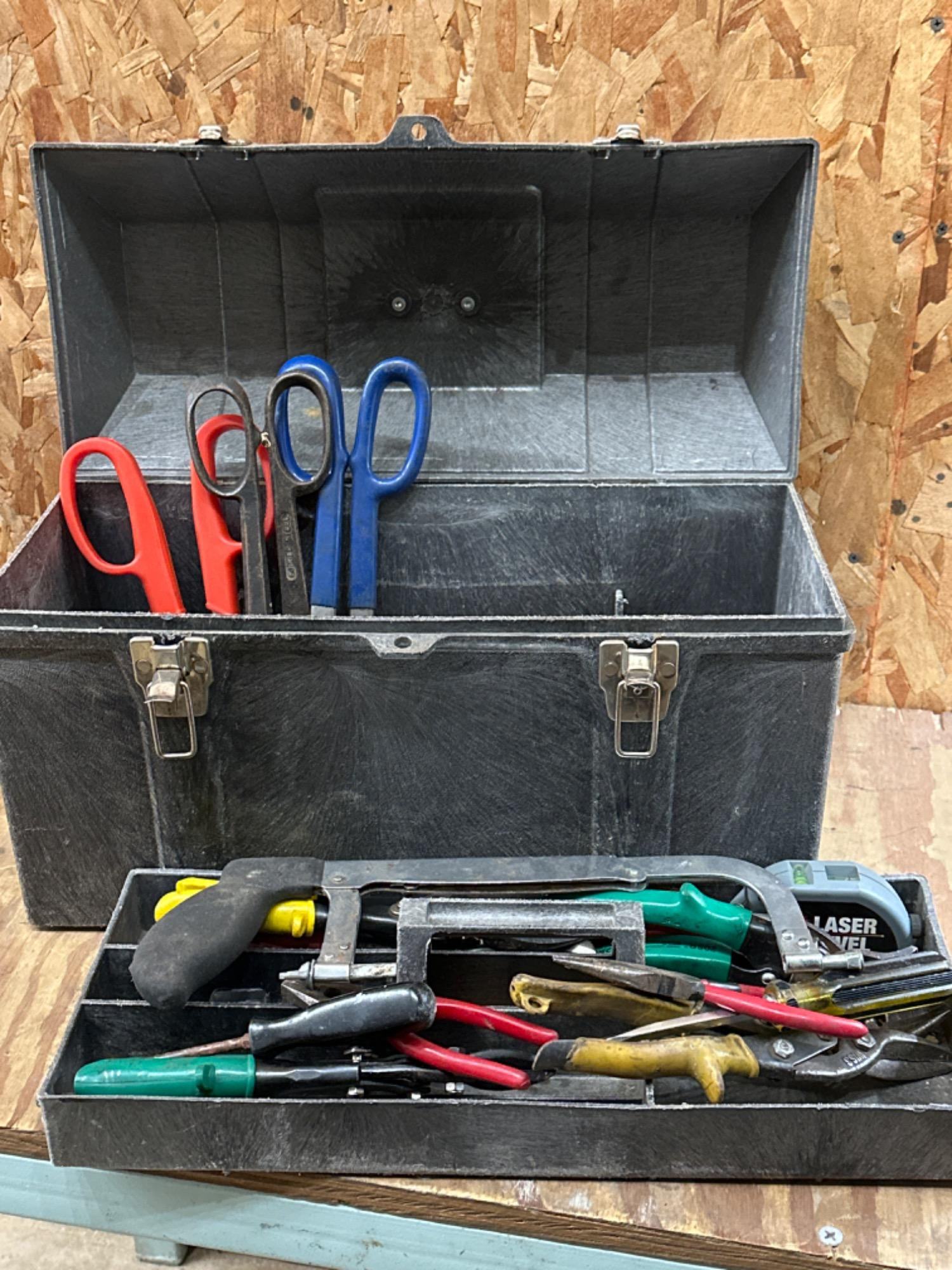 Box w/ Assorted Hand Tools- Laser Level, Clamps, Drill Bits, Scissors and more