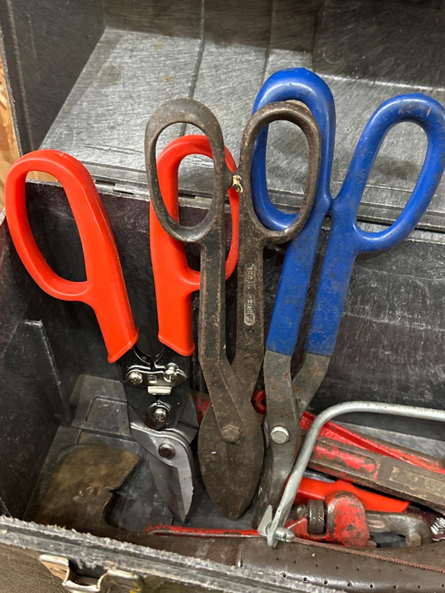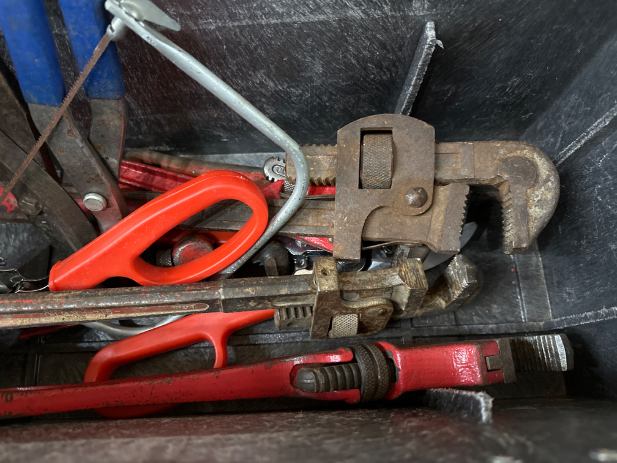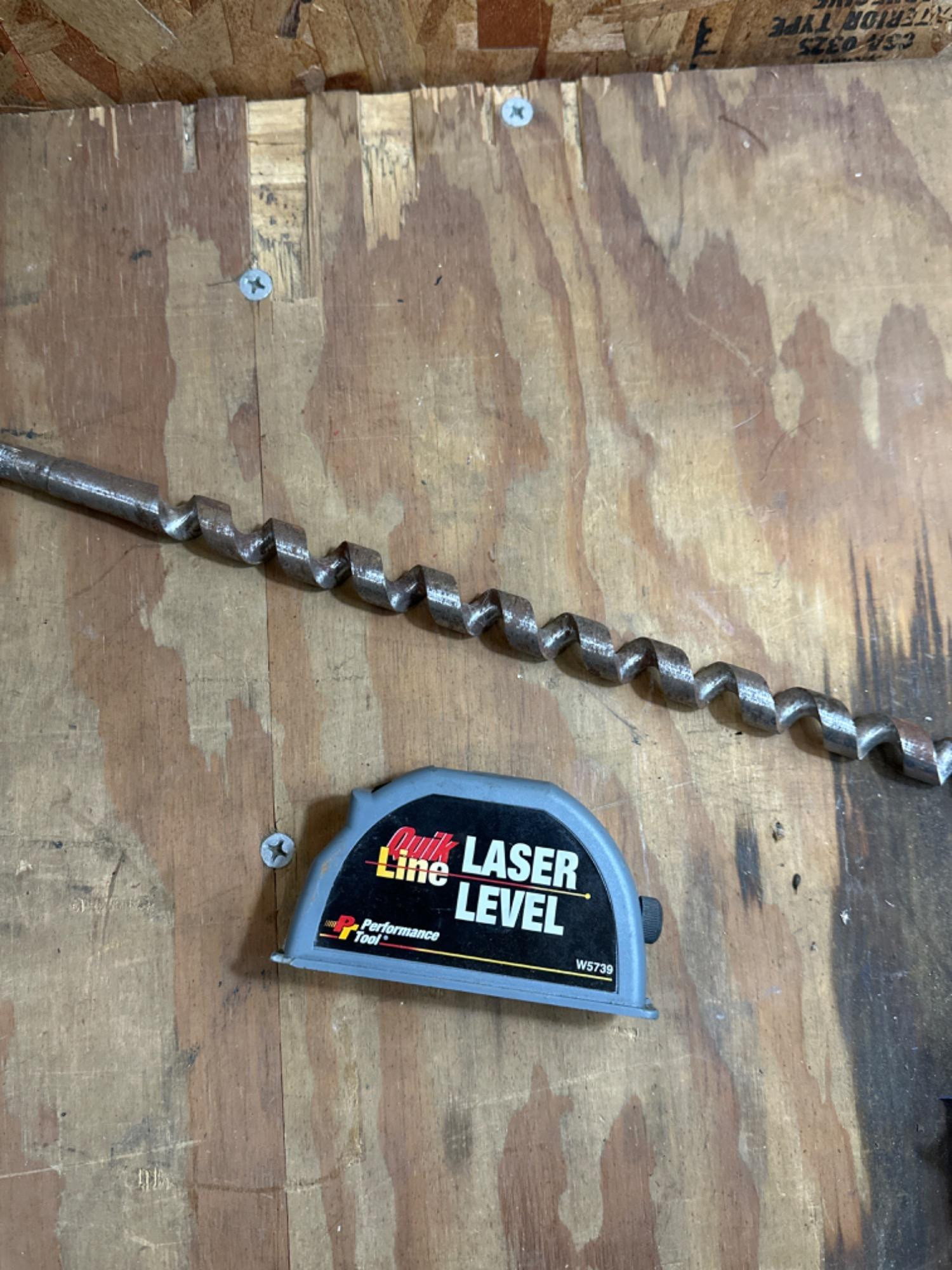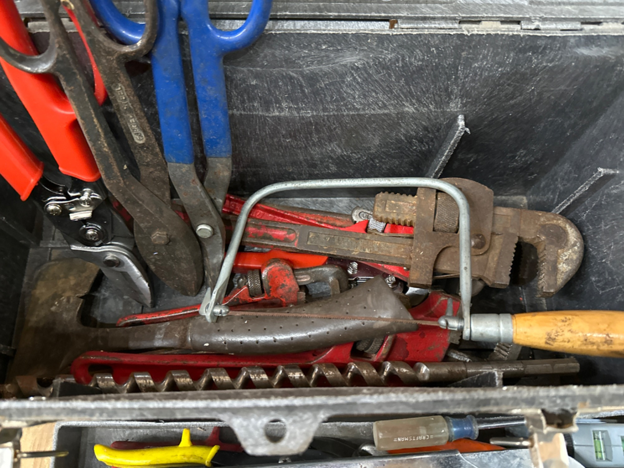 Box w/ Assorted Hand Tools- Laser Level, Clamps, Drill Bits, Scissors and more