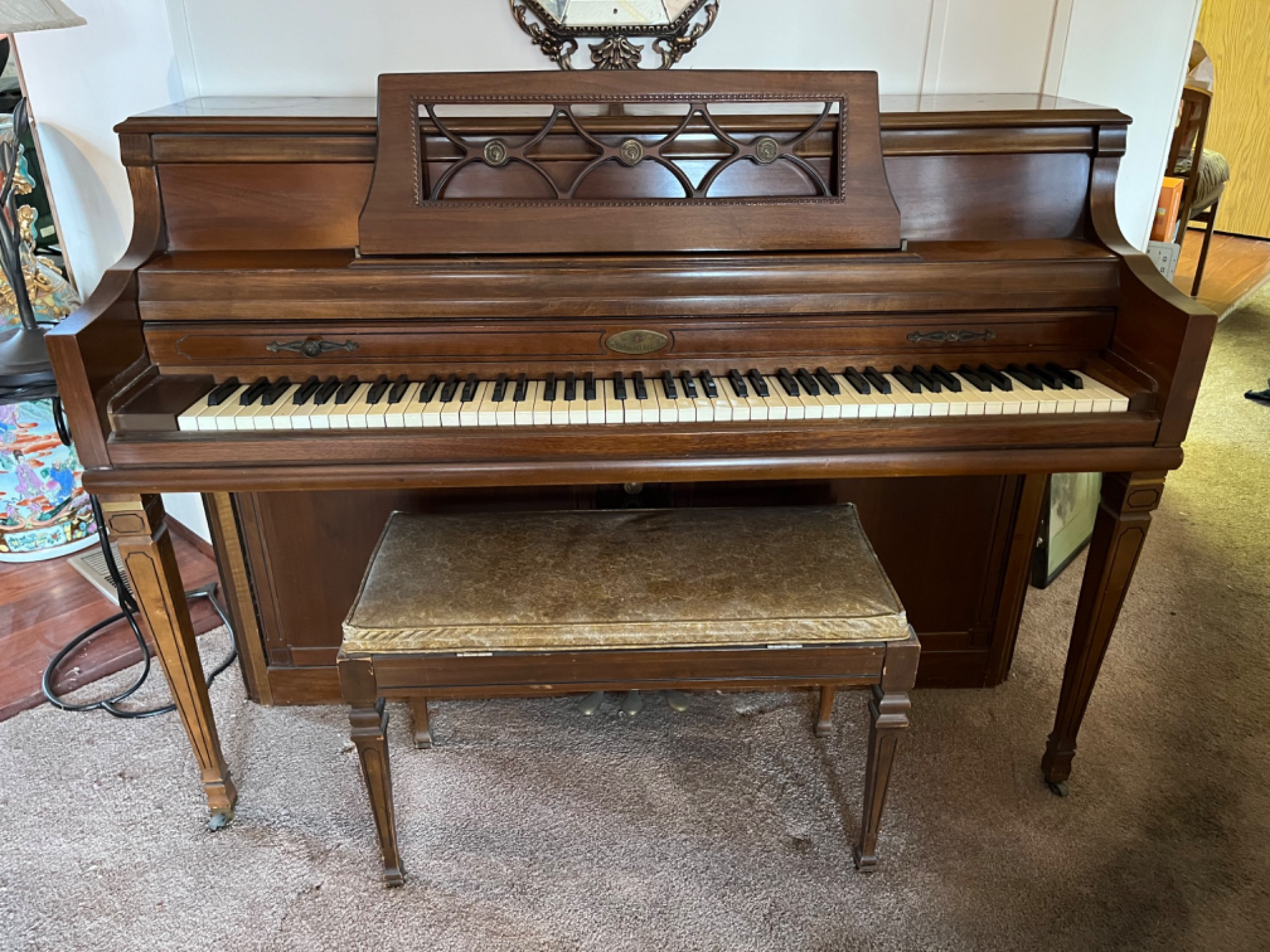 Needs to be tuned. Measures 40” h x 55.5” w x 23.5” d.
