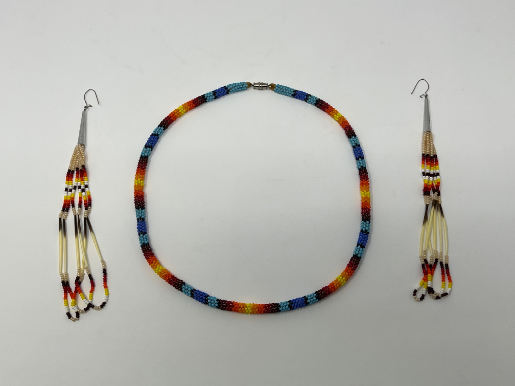 Glass seed beads and porcupine quills. Necklace is 20” long. Earrings are 6” long