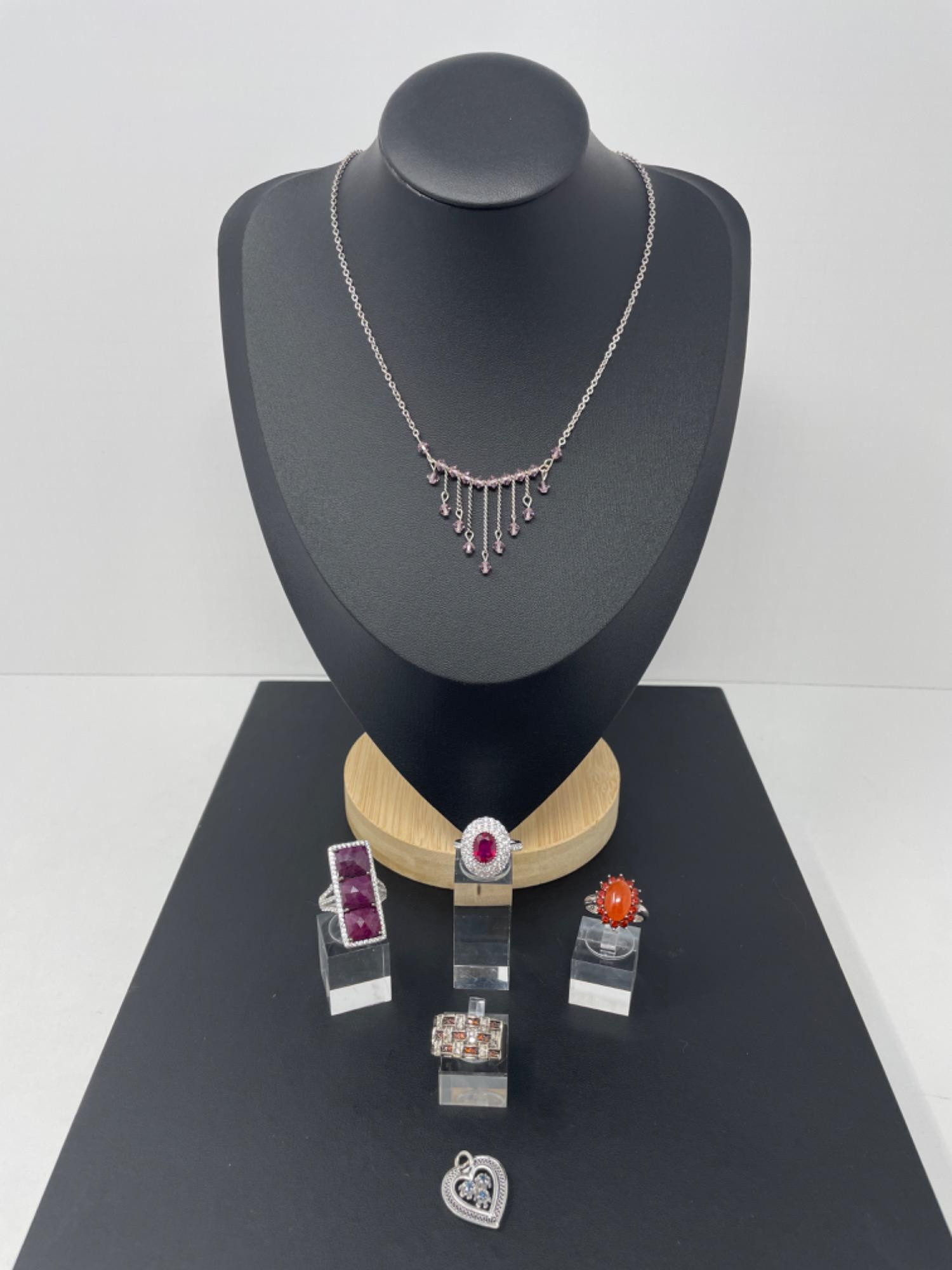 Liz Claiborne Choker Necklace/15” with 3.5” extension/costume pendant 925 Silver Jasper and Garnet Ring/size 6.5 925 Silver Synthetic Ruby with cz’s/size 7.5 14k white gold with alternating orange and white diamonds/size 7 Heart pendant