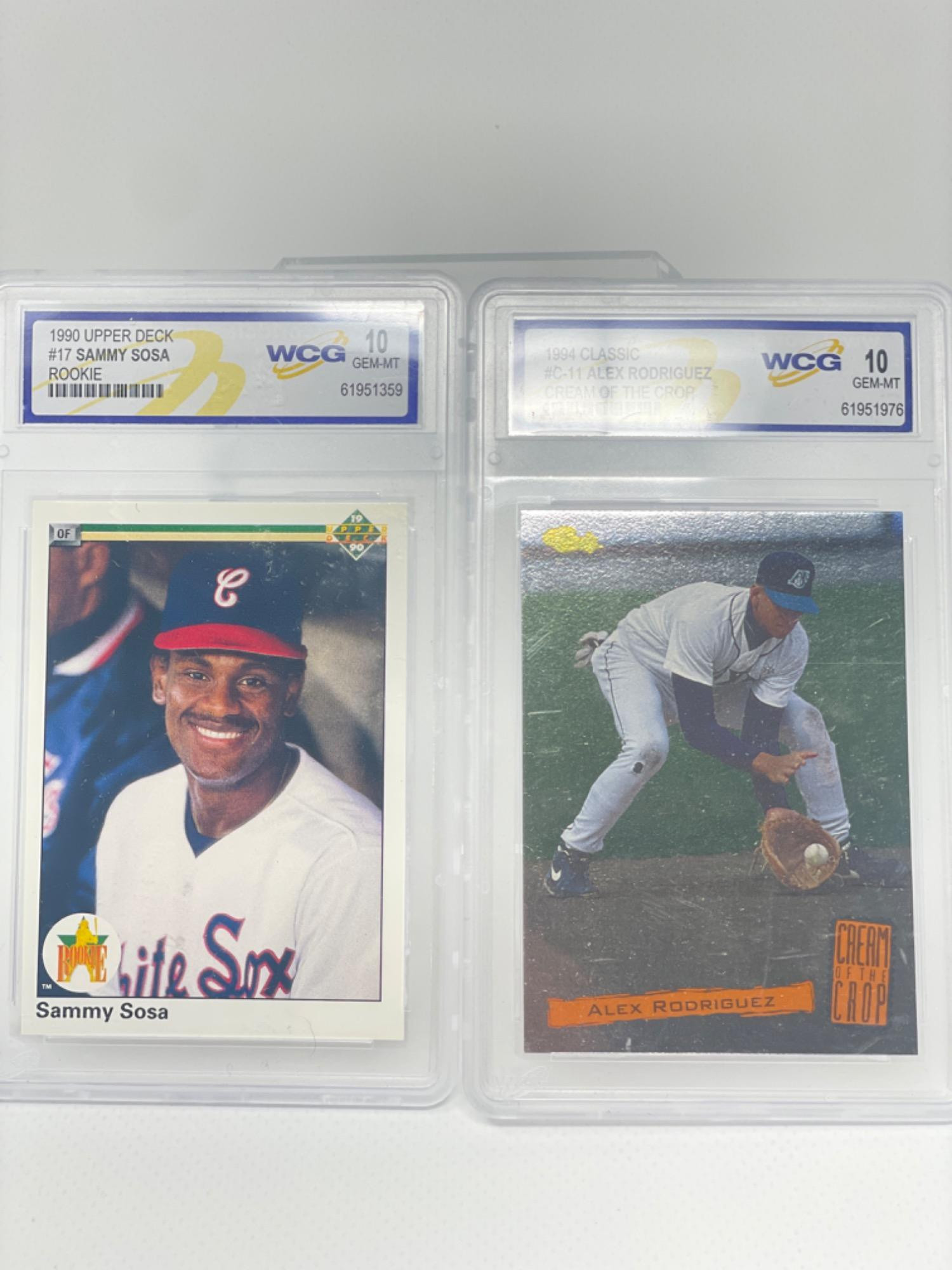 1990 Sammy Sosa Rookie card and 1994 Alex Rodriguez "Cream of the Crop" rookie card. Both Graded WGA Gem Mint 10