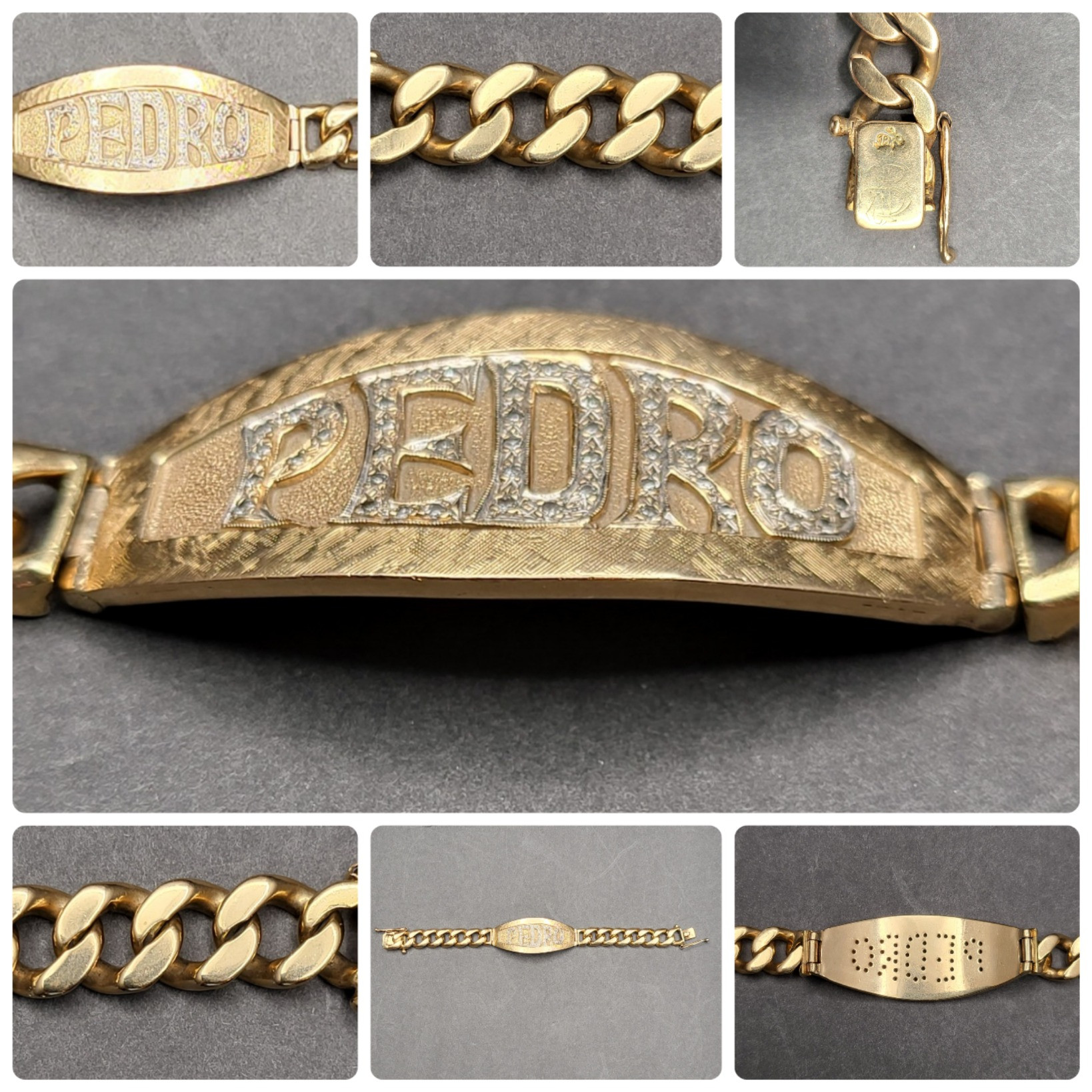 Impressive Men's Cuban link bracelet. Professional jeweler verified 18k gold and genuine diamonds. Push clasp closure with safety clasps. Bracelet is 8.5" long, made up of 13mm Cuban links and weighs a total of 105 grams (including diamonds). The name Pedro, encased in 54 sparkly genuine diamonds Over $8,000 value.