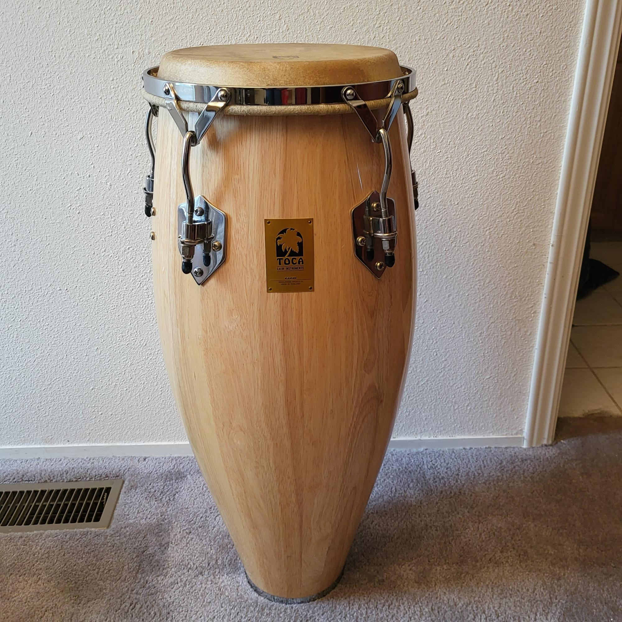 30" Tall, wood Bongo drum measures 30" T x 11" W drum skin. Gator nylon carry bag with handle and backpack style straps. Kamen Percussion Instruments and Made in Thailand. Chrome hardware. Top Tuning.
