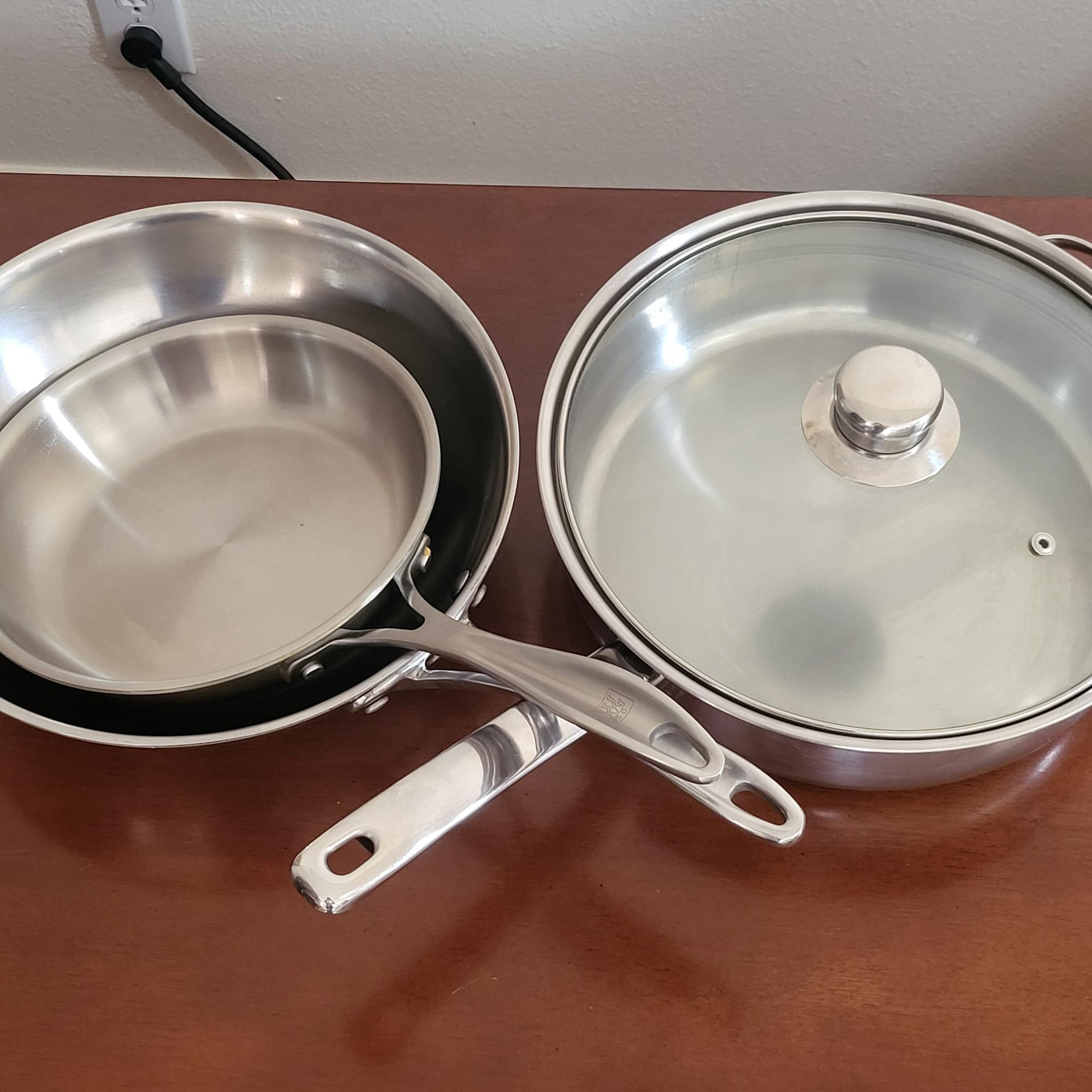 10.5" glass lid Belgique fryer 10" Calphalon, rounded sauce/wok/fryer pan Zwilling J.A. Henckels 8" fry pan