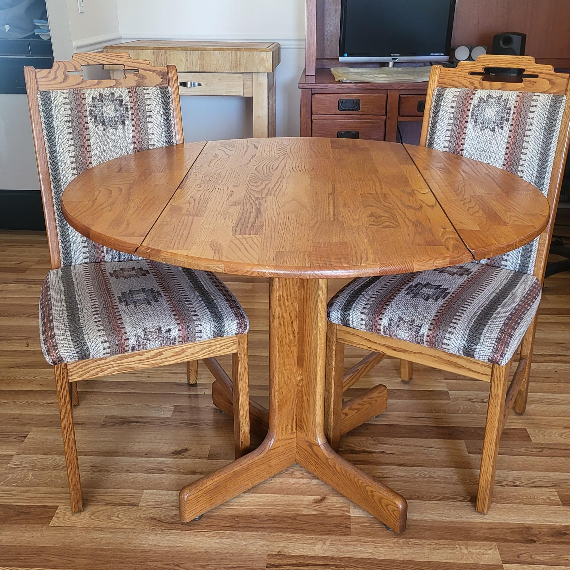 Double drop leaf. Table is 40" round 29.5" T (22" W x40"L when sides are down) Two upholstered chairs 39" T x 17" H to seat. Seat is 18" x 17" Bidding on this lot is an agreement that: (1.) You
