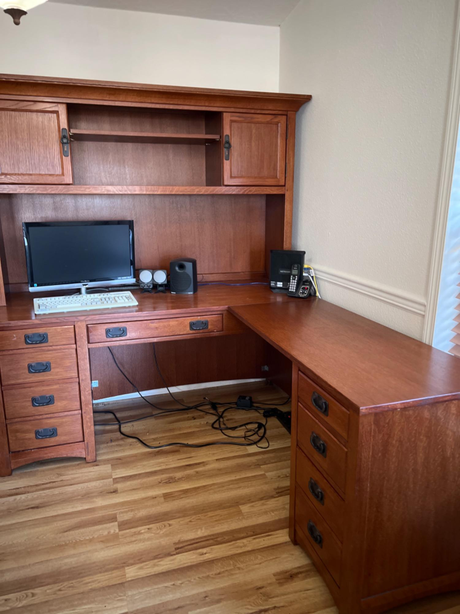 Gorgeous (like new) L - shaped executive desk by Shanandoah Valley Furniture. Has hutch with cupboards. Desk includes a side compartment for a CPU and drawers in the side desk. Overall this L-shaped desk measures 76” long x 66” wide x 72.5” tall x 28” deep (main desk) x 21” deep (side desk). Desk: 66” wide x 28” deep x 30.5” tall Hutch: 66” wide x 18” deep x 42” tall Side Desk: 48” wide x 21” deep x 30.5” tall DESK ONLY. Does not include the computer monitor and other equipment. Bring own tools to dismantle desk (hutch detaches, side desk detaches). Bidding on this lot is an agreement that: (1.) You