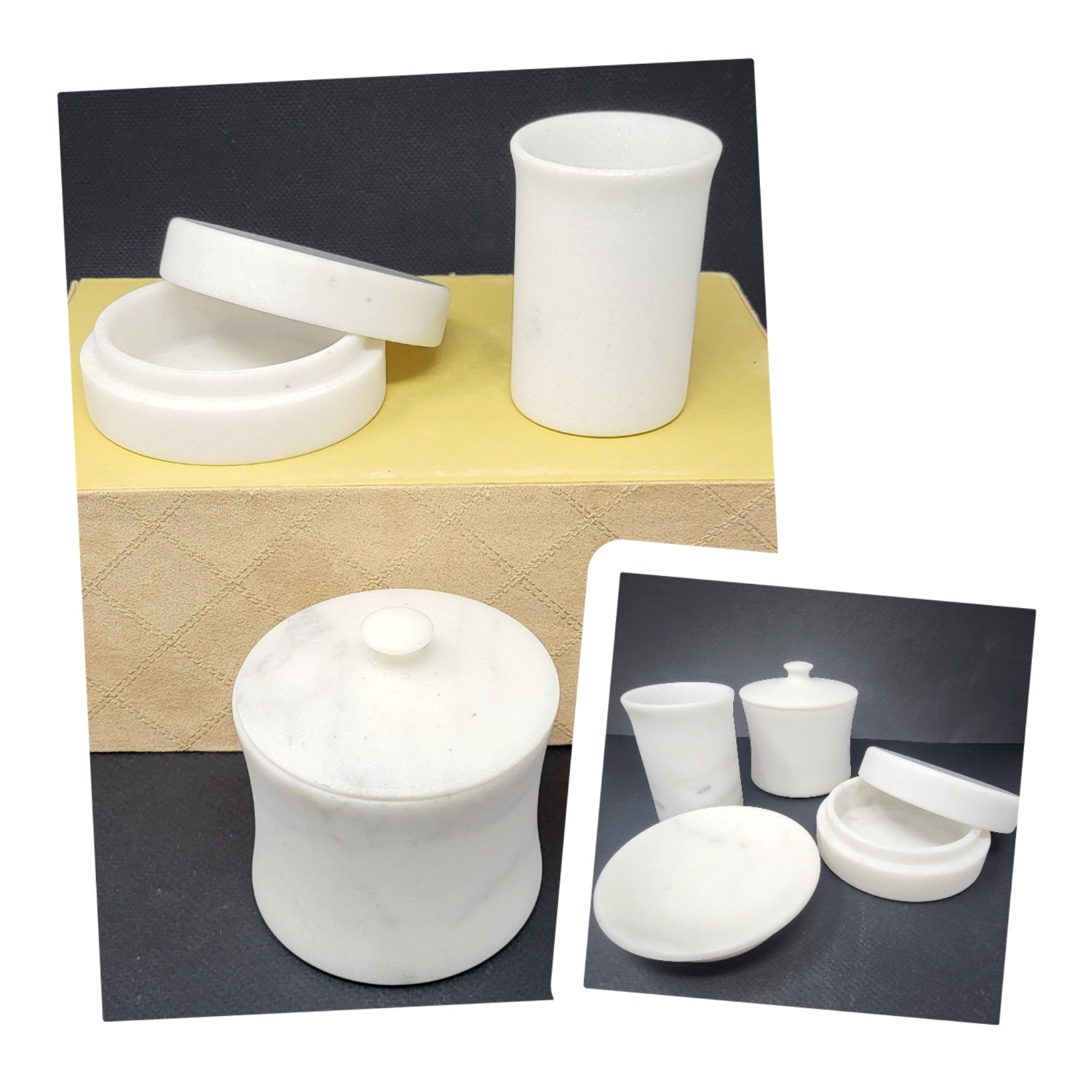 Solid white marble vanity/bath sets. Two tumblers, two round lidded jars, two lidded canisters and one soap dish.