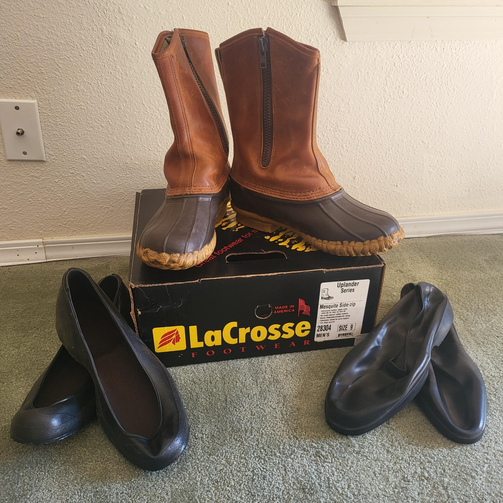 Uplander Series LaCrosse rubber boots, men's size 9. Two pairs of slip over shoes rubber shoe protector size 8.